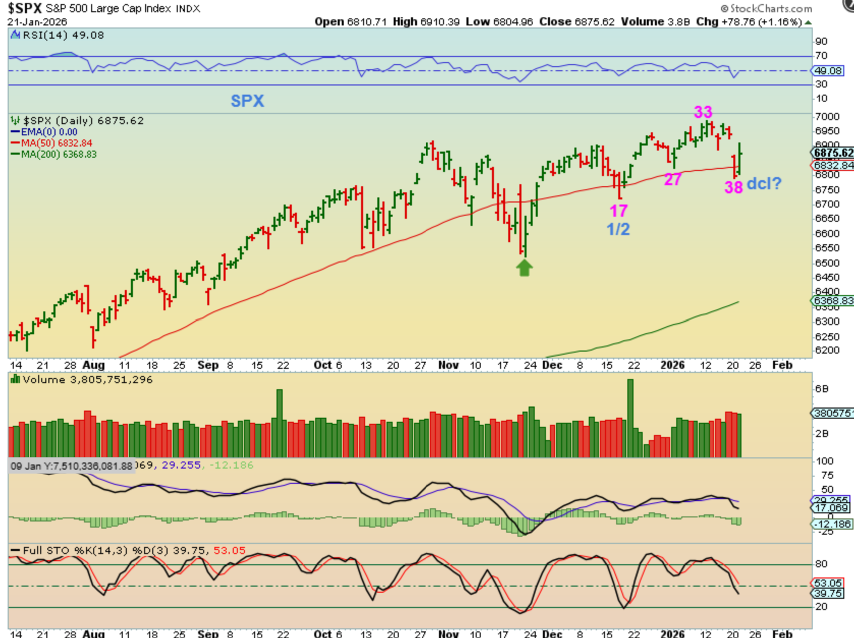 SPX – This chart makes it look like we sold off sharply on Tuesday and recovered quickly on Wednesday, but it wasn’t that simple in real time. The markets did rally in the morning, but they sold off midday right back to the lows. They then rallied into the close when Trump announced that he would not add tariffs to the 8 countries that he had threatened over the weekend. This does look like the dcl at day 38, with a peak on day 33 (R.T.).