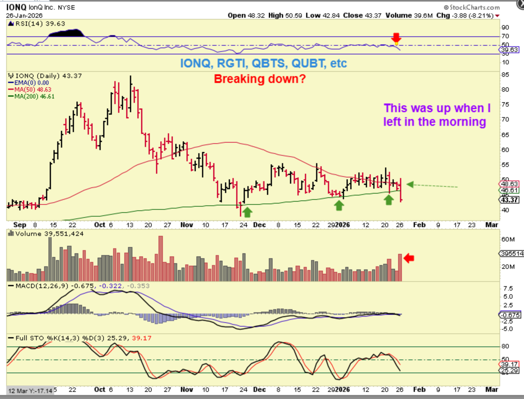 Please take a good look at this chart of IONQ. It was bullishly crawling along the 50sma, and when I left yesterday it was up a good amount. It sold off and lost the 50sma with the other Quant and Nuke stocks. So the small caps are starting to look weaker and that needs constant monitoring. I have been stopped out of positions.