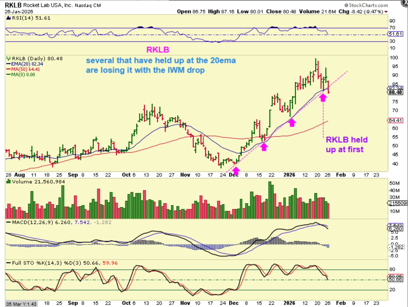 I did notice that some of my favorites are pulling back, like RKLB, ONDS, UMAC and some others, but they are breaking below the 20 ema support that was holding up as support for price. I’m wondering if that is because the IWM is dropping? I’m not sure, but I know that some that break the 20 ema may actually back test the next support. That could be the recent breakout to new highs, or it may even go down to the 50sma. RKLB ran from $38 to $100 out of the ICL, no complaints there!