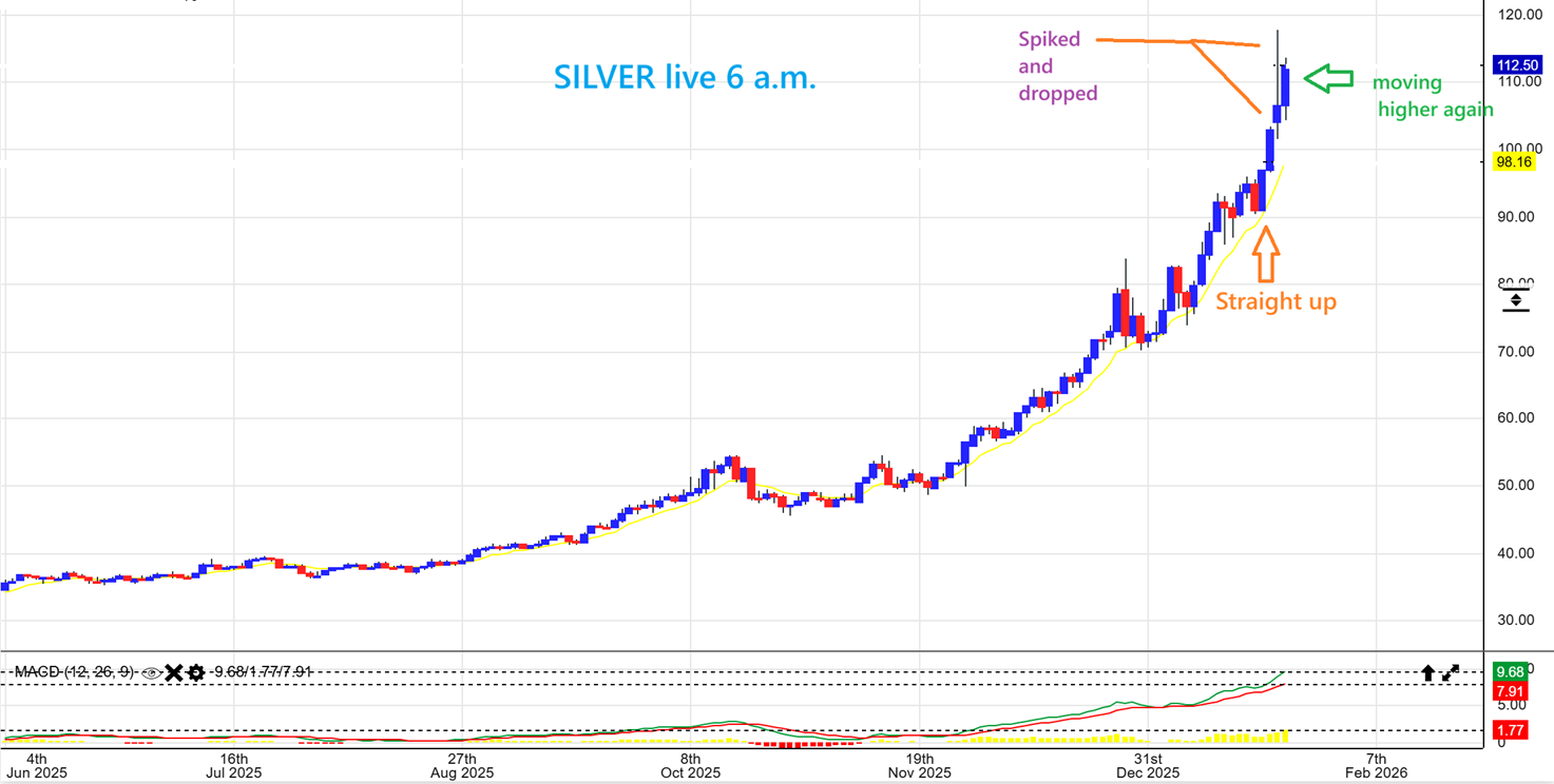 Silver actually did a large pop and drop yesterday, and that is often a topping candle, but the surprise is to the upside as Silver continued higher overnight. Silver is going straight up over the last 4 days and has surpassed many measured ‘targets’ of a normal run. On this chart today is day 19.