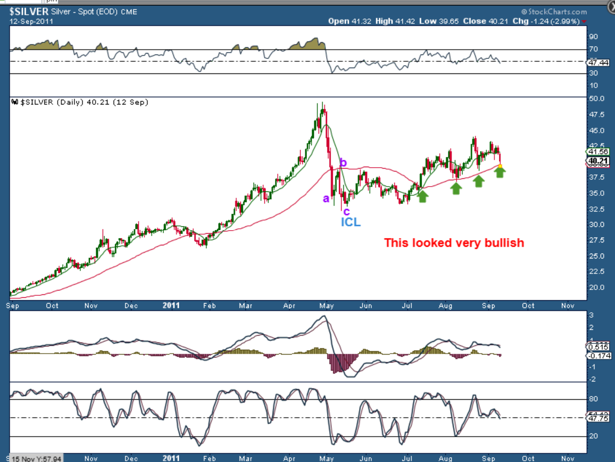 I shared these charts of Silver in 2011. You can see that Silver put in a decent bounce in the following intermediate cycle, but the ‘peak’ remained ‘the peak’, and Silver never ran to new highs again in the coming years. This chop higher for Silver may have looked convincing with this bounce along the 50sma. It lasted for months (A new Intermediate Cycle), but…
