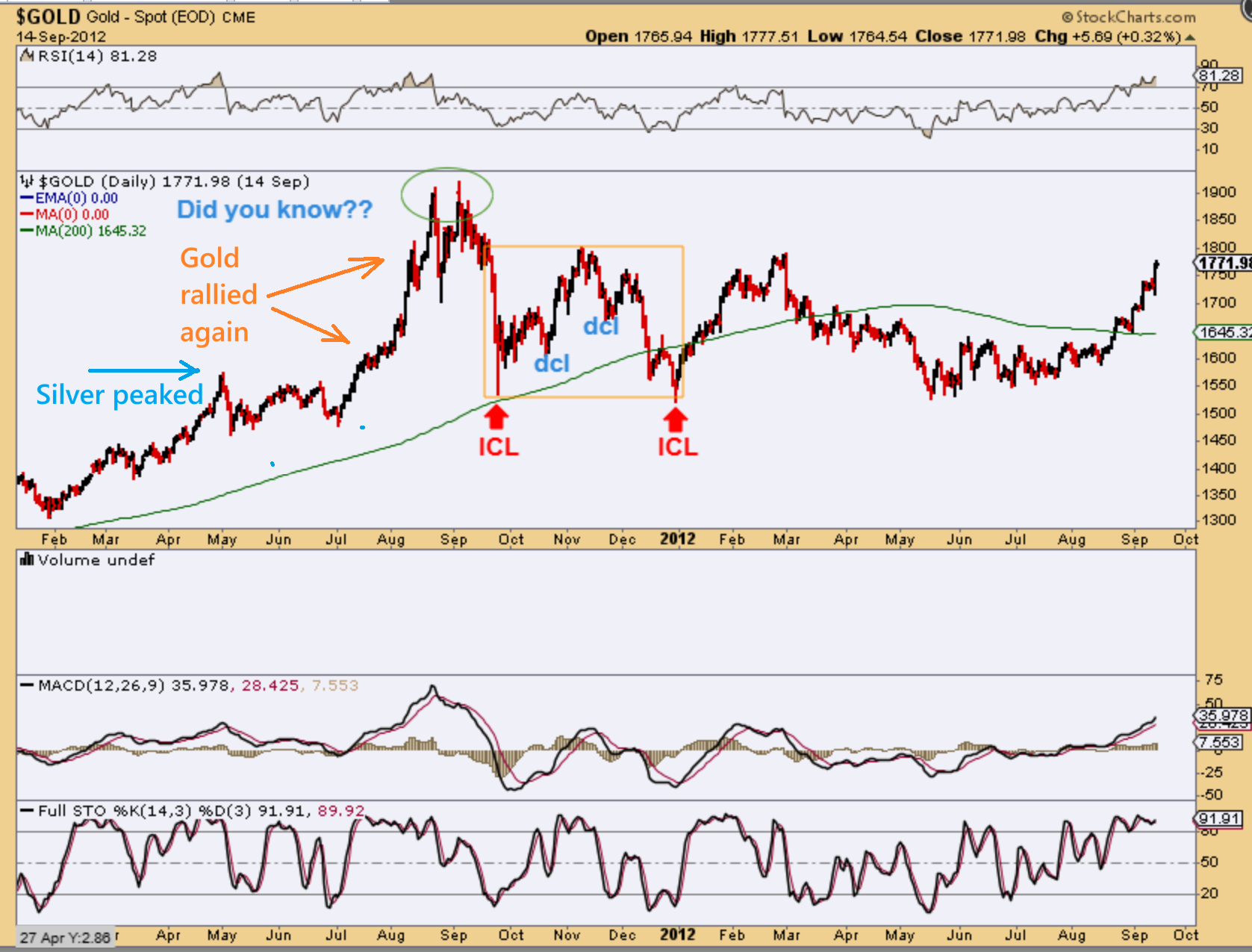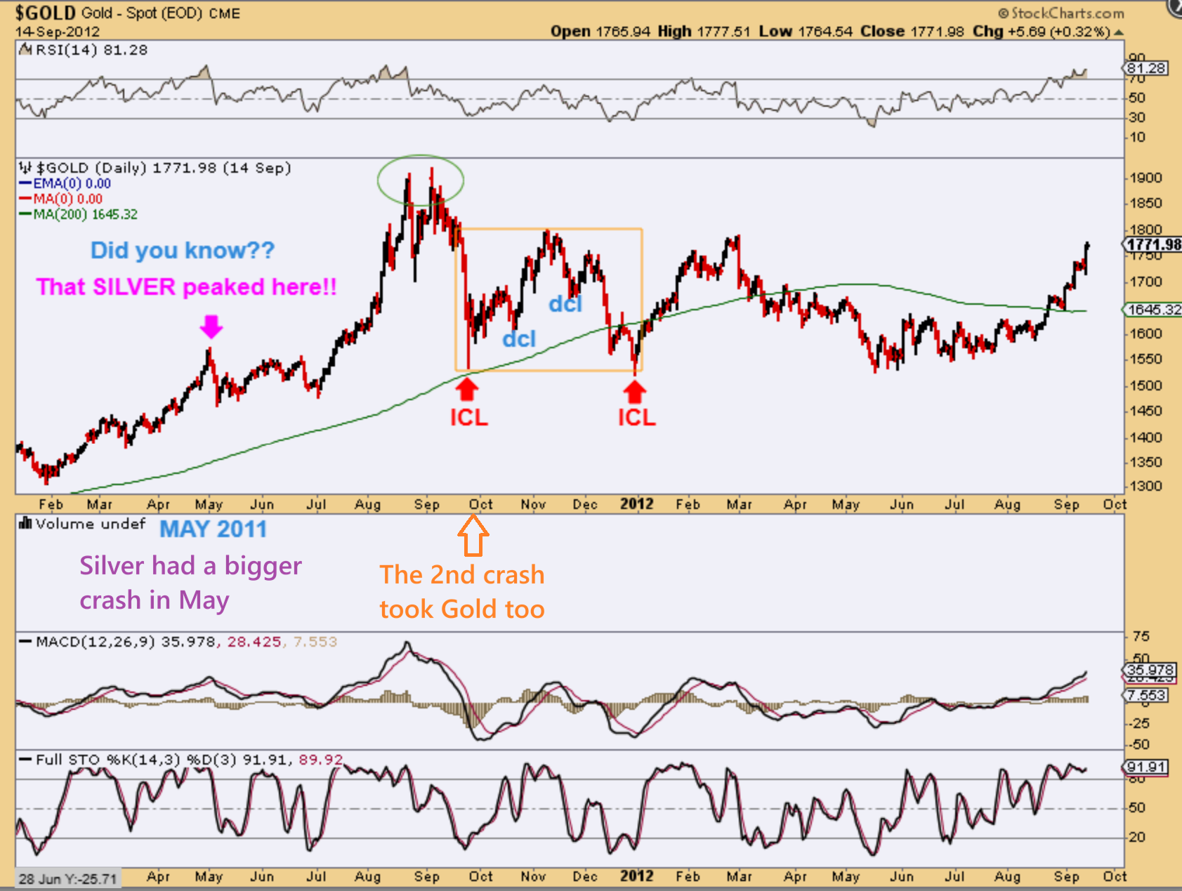 GOLD dropped when Silver peaked in May 2011, it then consolidated for a month or 2 and then Gold rallied to new highs again. It peaked with a double top in August and September of 2011. So…