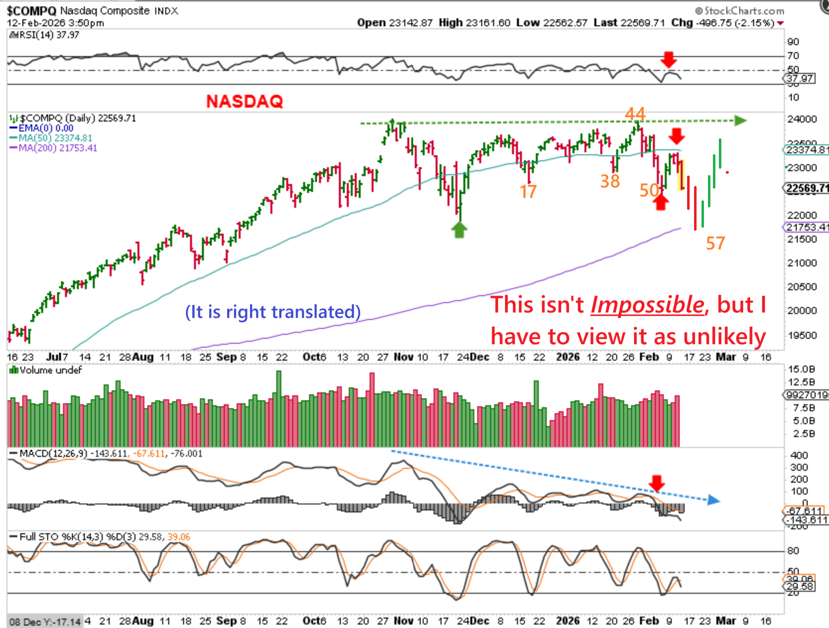 I just want to mention this: The Nasdaq did peak on day 44 of this daily cycle, so it is Right Translated and a drop to day 57 at the 200sma COULD BE the dcl ahead of us, or even the real ICL. A drop to the 200sma would break the low that I had labeled as the ICL. I have to view this as less likely due to all of the warning signs.