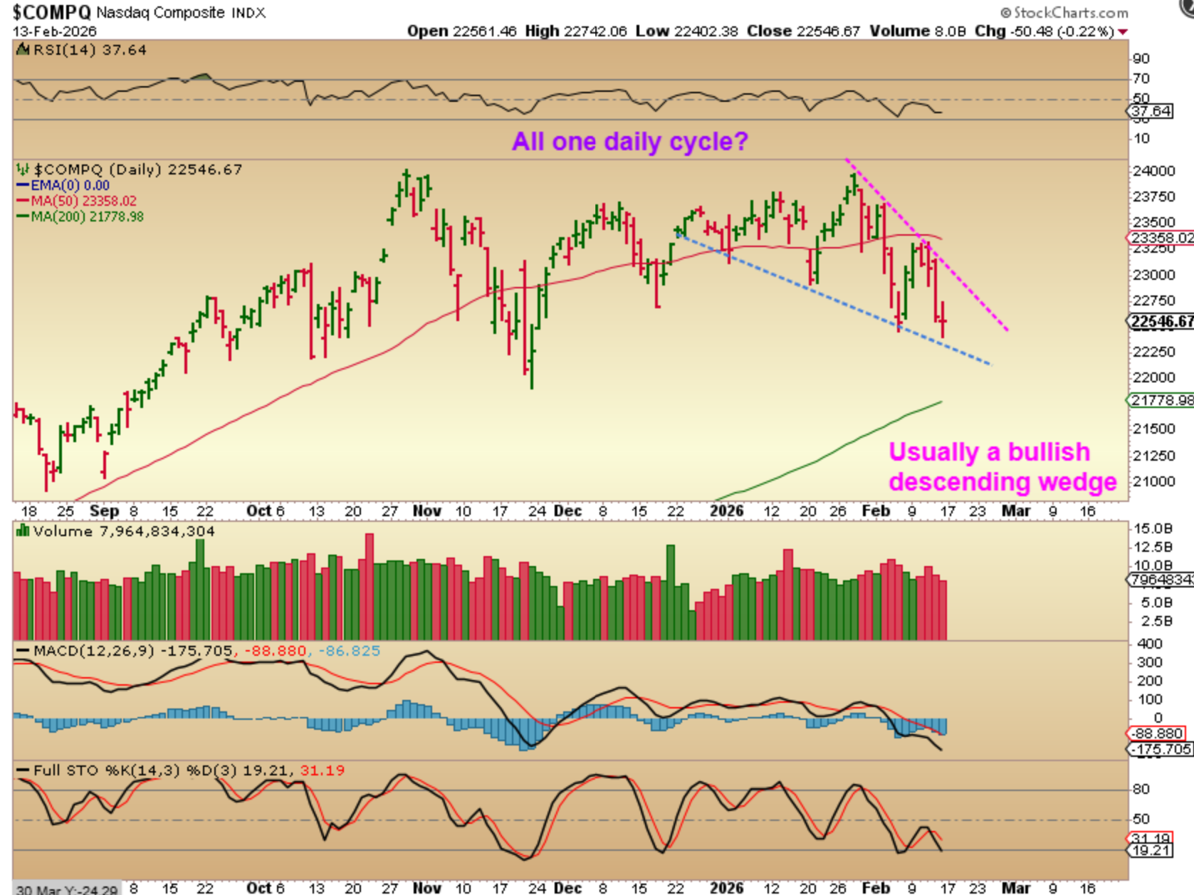 THE NASDAQ slightly cut to a new low on Friday, so is that a failed daily cycle? Is that an extended daily cycle? It could be either, but I do see a bullish descending wedge, and those are often resolved to the upside (bullish), so time will tell. I want to review the idea again that this could be all one daily cycle…