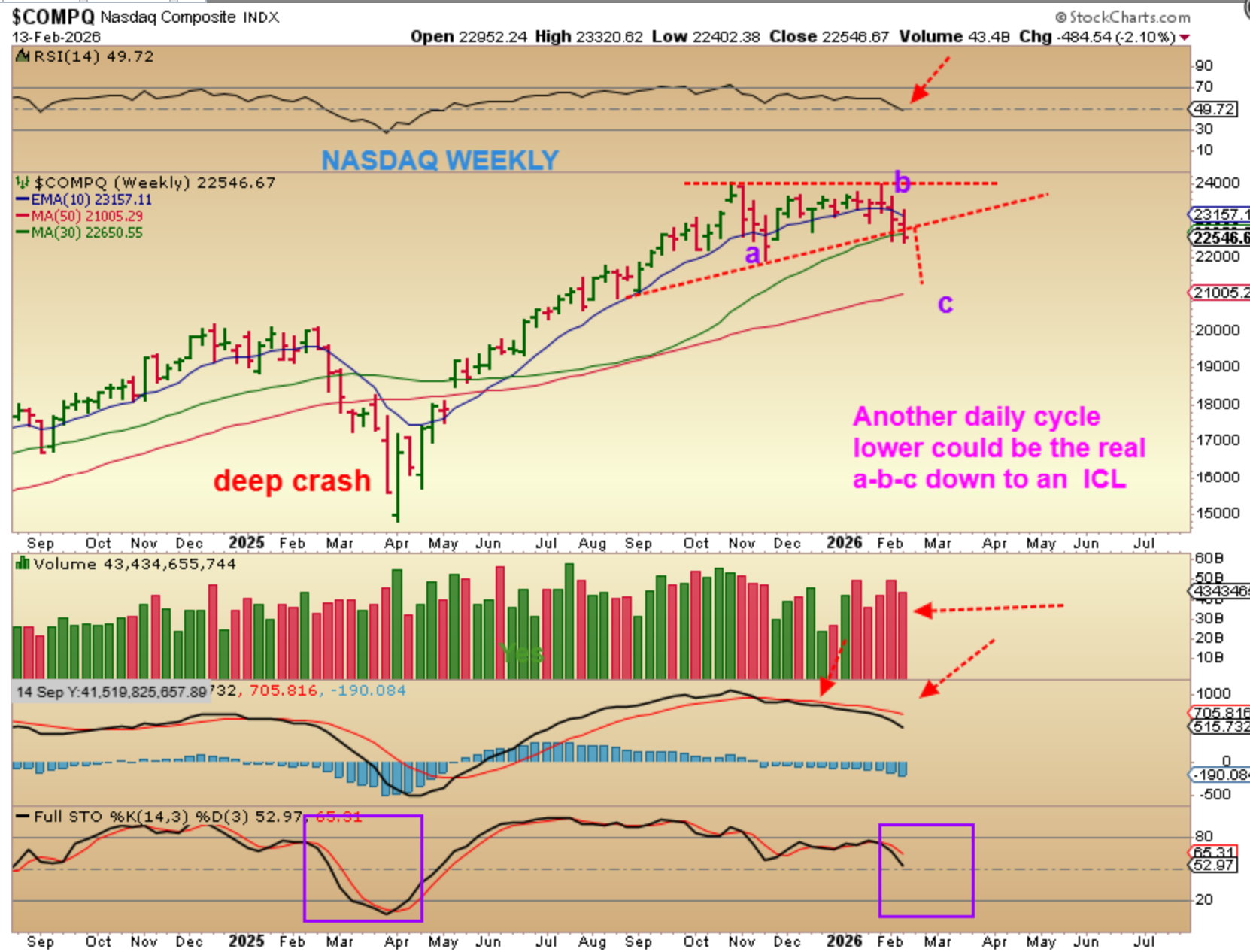 IF THE NASDAQ SELLS OFF FURTHER, we could get an a-b-c drop to the 50 week ma as an ICL as drawn here. Unfortunately, that still doesn’t explain the SOX & IWM, so that may take some time to resolve. Maybe the NASDAQ will not break below that current low identified as the ICL? We’ll see.