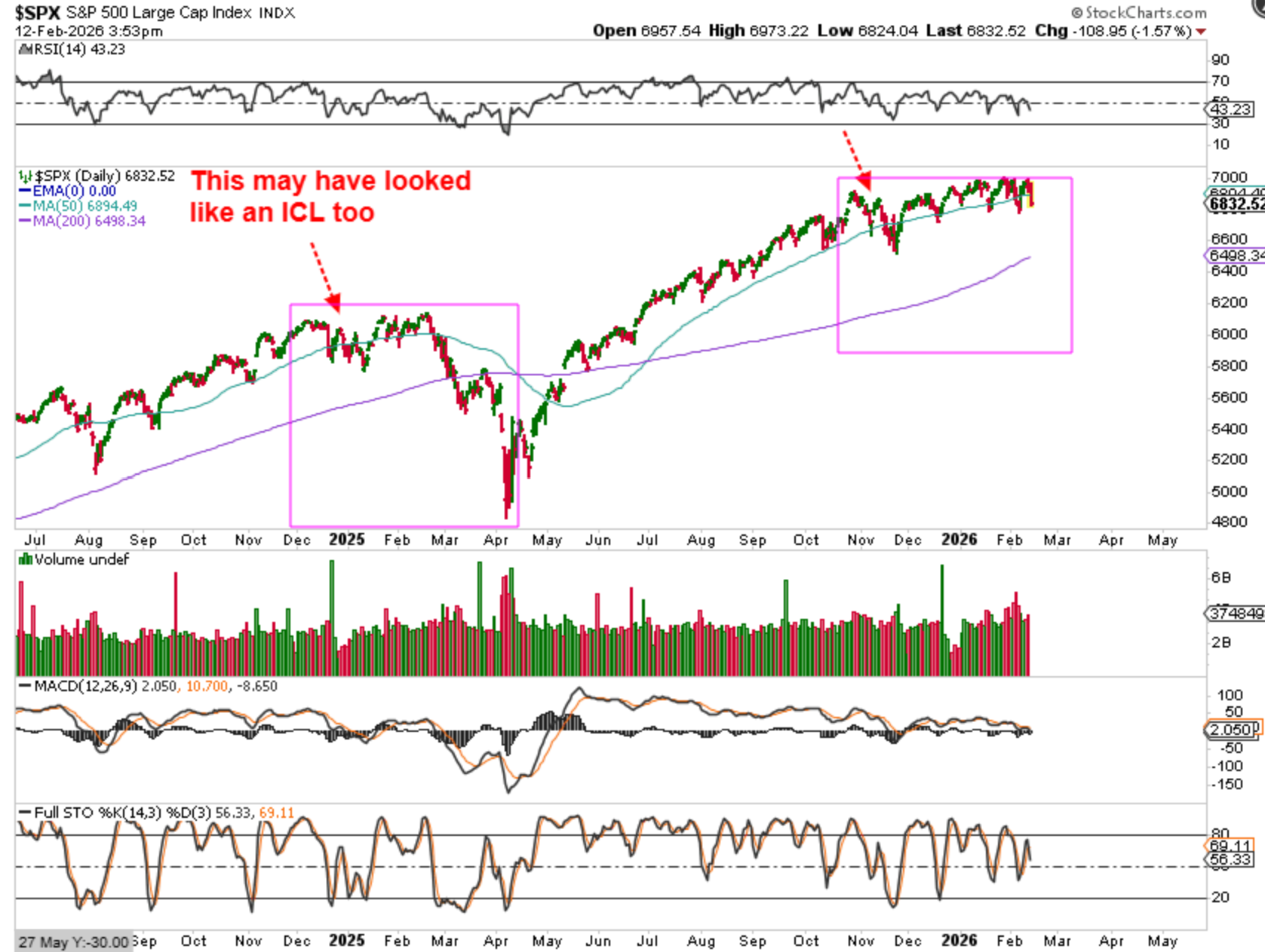 SPX – I wanted to point out the same thing here. In 2024-2025 we dropped into what appeared to be an ICL in January 2025 and then rallied up into choppiness. That was when Trump kept calling for tariffs sporadically and then reducing or removing them. The uncertainty caused chop and suddenly we just went into that sharp ICL drop. It does look similar to now. The good news would be that after that ICL in April, MANY stocks ran up double, triple, even 7X gains for the buy and hold crowd. ICL drops are horrible in real time, but when the dust settles, stocks can make fantastic gains.
