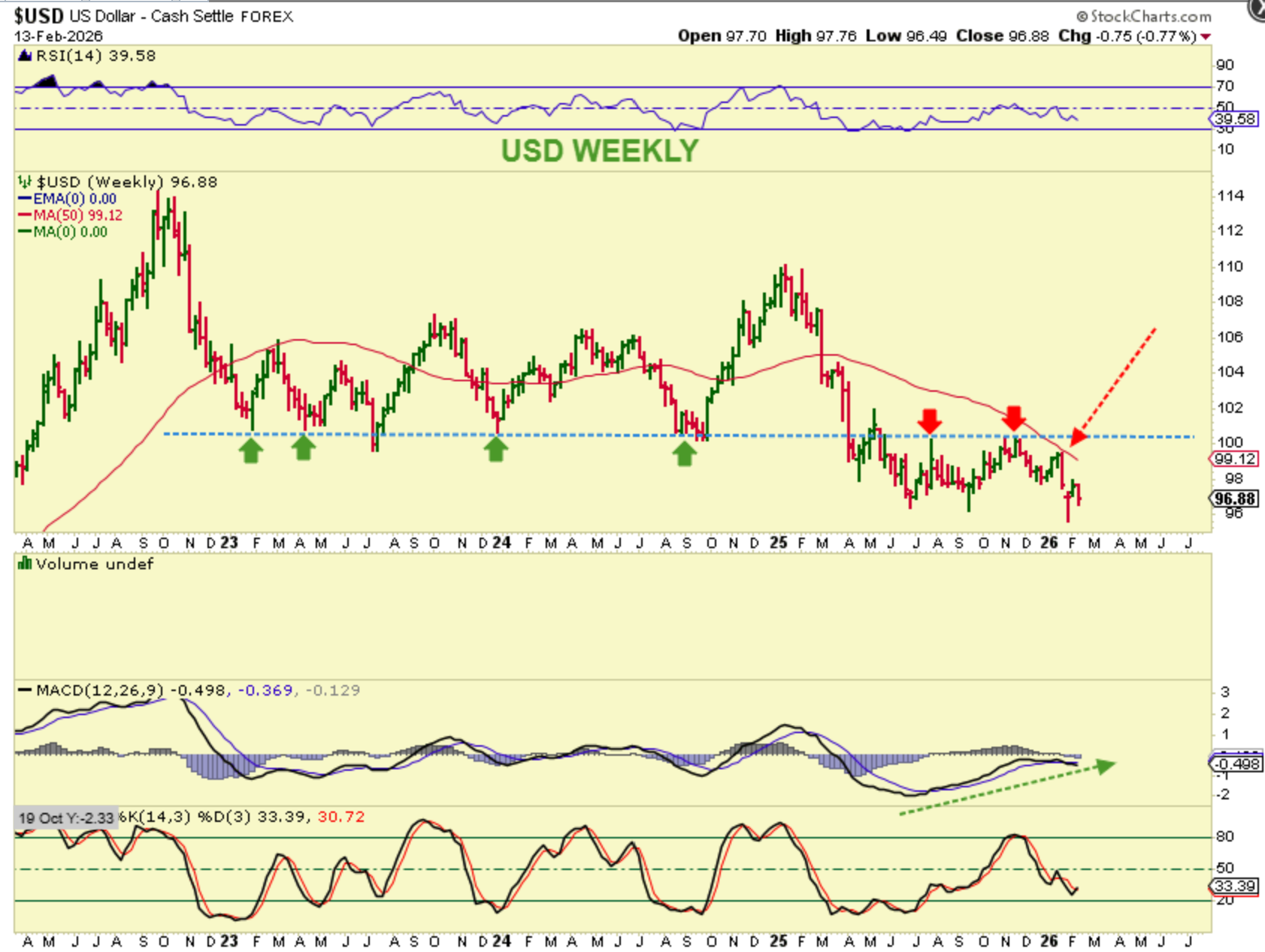 THE USD put in a low 3 weeks ago after being rejected into a sell off at the 50 week ma. It has struggled and was choppy & weak for most of 2025, but the weekly MACD does have divergence, and I expect the USD to be able to push higher from here. First it will need to attack the 50week ma, and if it gets through it, the blue line is strong resistance too.