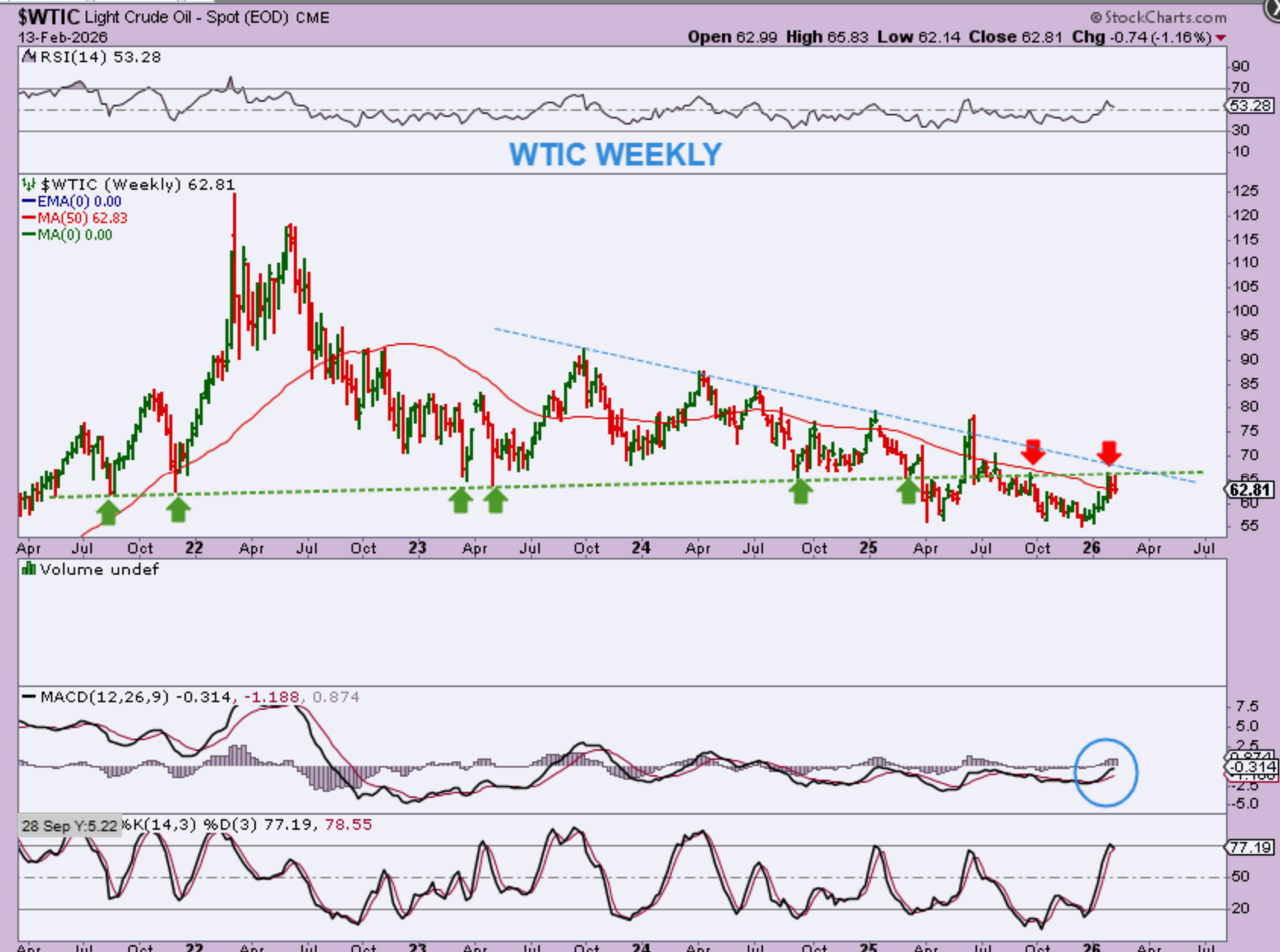 WTIC – Oil was doing well, moving higher out of the recent low, but it has hit the $66 area and pulled back for 3 consecutive weeks. It has hit resistance in the form of prior support turned resistance (the green line), so a pause is understandable. Next, we’ll see if it has the ability to gather strength and push higher, or will it continue with the choppiness that it has been experiencing for years. Getting to $70 or above is bullish.