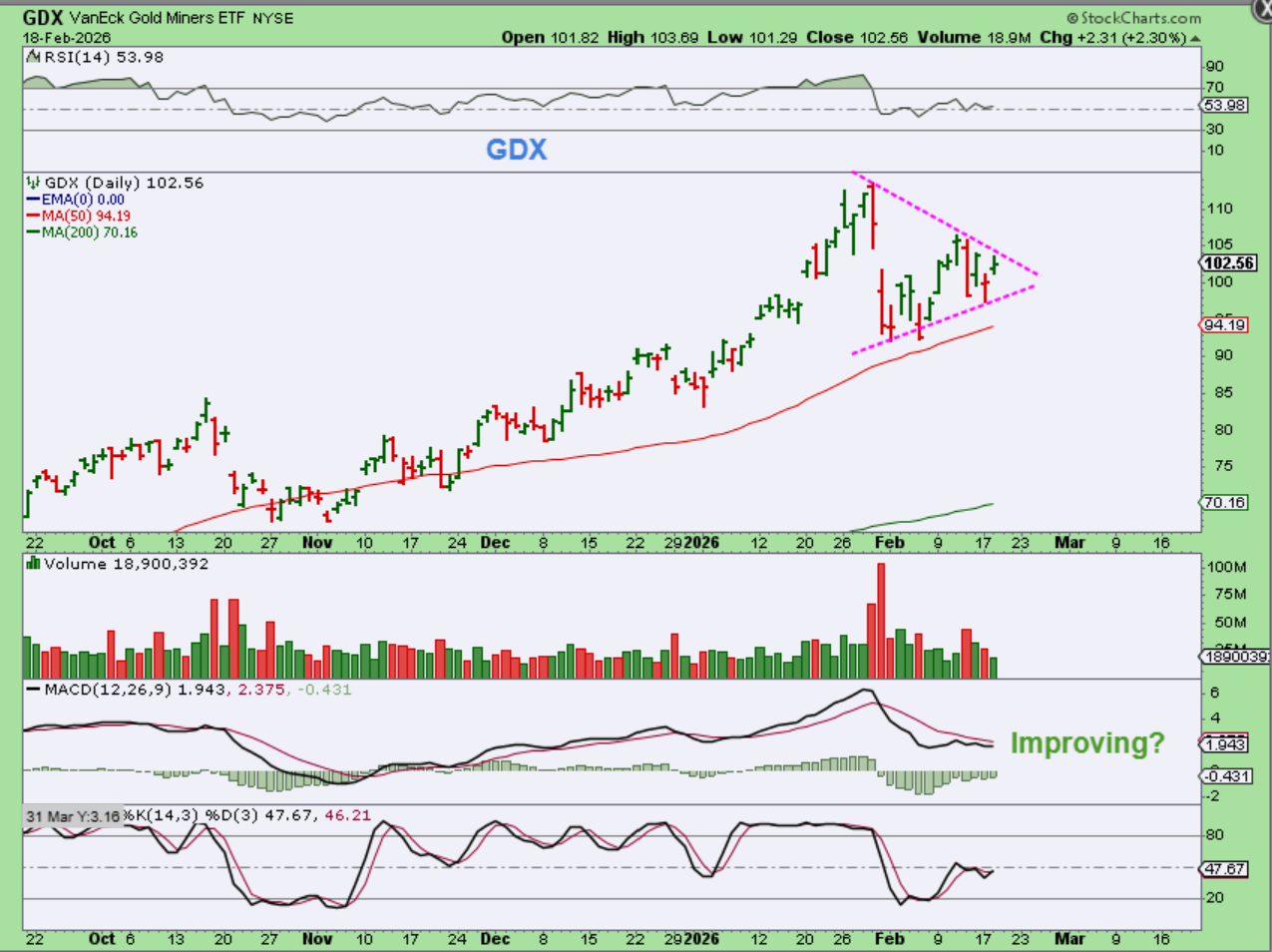 THE GDX follows Gold more than it does Silver, and a triangle consolidation seems to be developing. If Gold and Silver continue higher, then Miners would also.