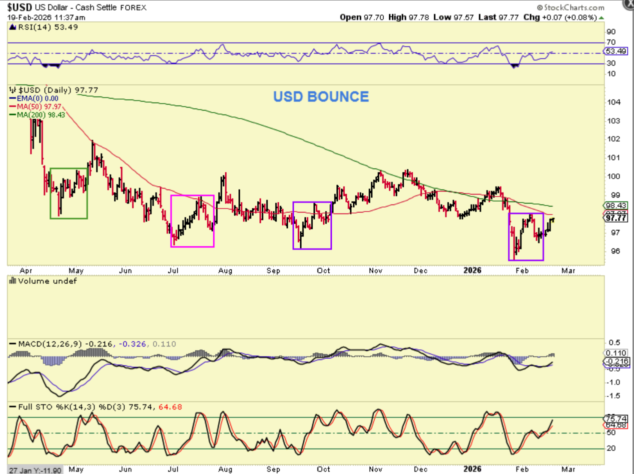 THE USD has started to bounce after a higher low was put in place. This is what I expected, as seen with the ‘boxes’ of prior similar set ups. This bounce has not caused Gold or Silver to sell off.