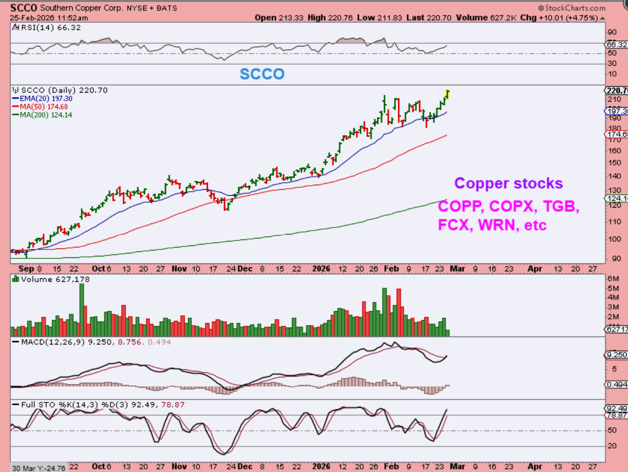 SCCO – Copper stocks were mentioned here recently, and SCCO is another that is at new highs as of yesterday. I like TGB, WRN, FCX, COPX, SCCO, (& COPJ is Sprott). All of those charts are VERY Similar.