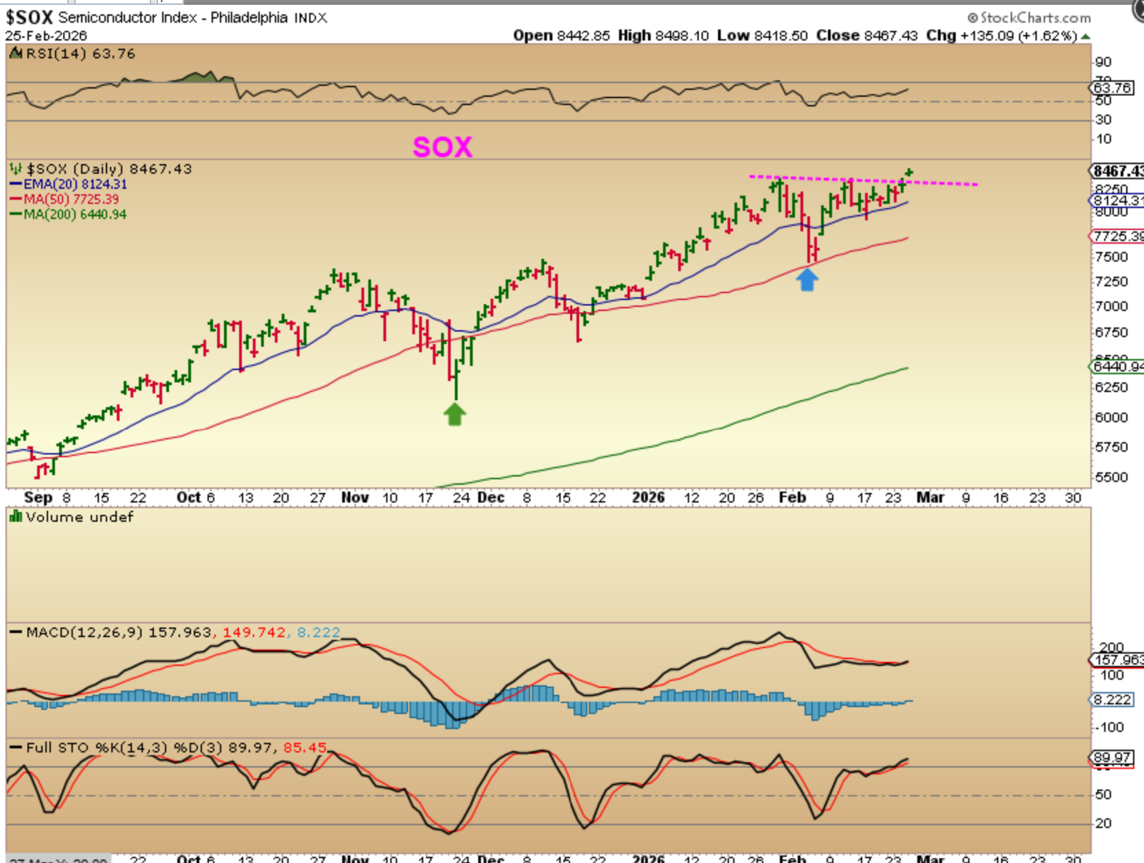 The IWM looks bullish as it forms a triangle and recovered the 50sma. You can see that we still have mixed markets when it comes to strength, with the IWM looking much more bullish than the Nasdaq so far. And then comes that SOX chart…