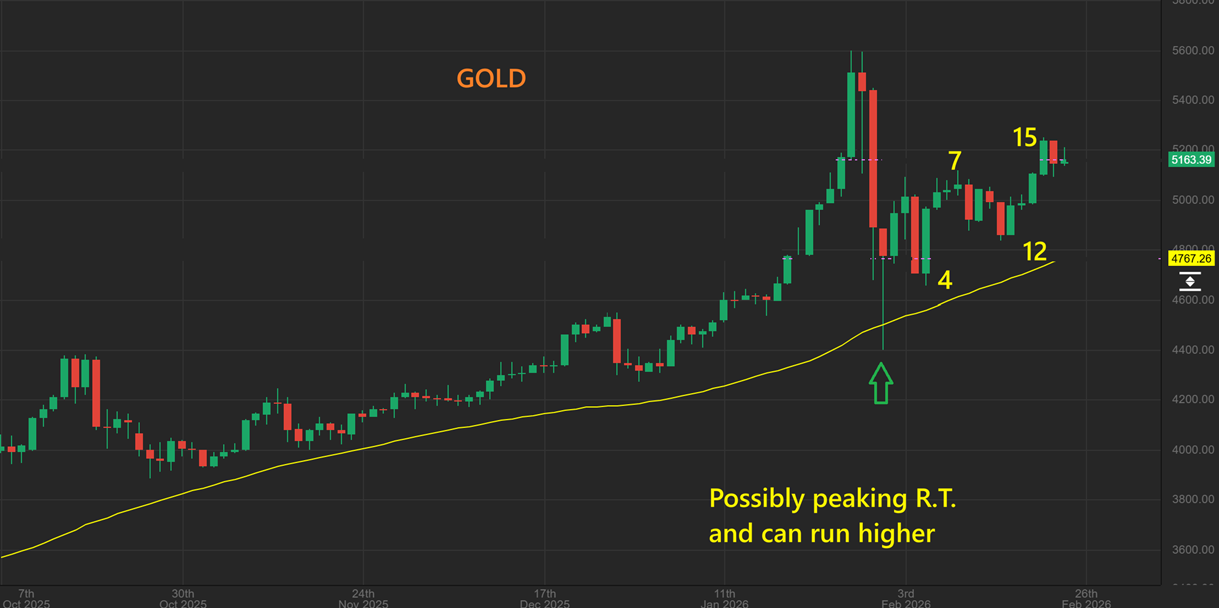 GOLD 6 am – This morning I am seeing Gold slightly green, but notice that we have a peak on day 15 so far, and it could continue higher, so we are leaning toward this becoming a R.T. daily cycle.