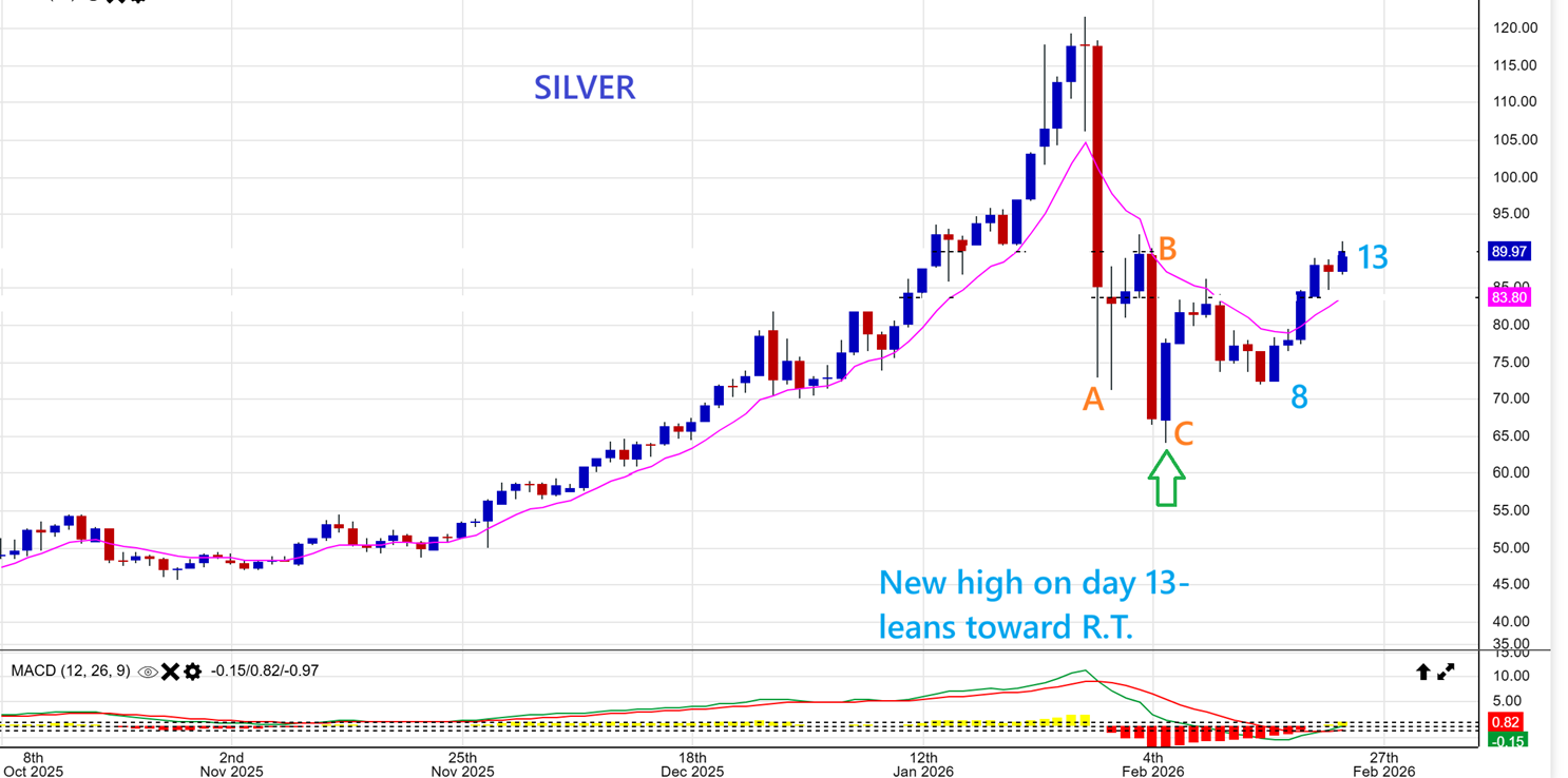 SILVER 6 am – Silver bottomed after Gold, so it is on day 13 today and so far that is the peak for Silver.