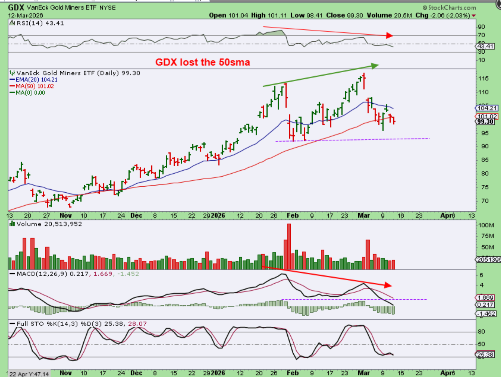 GDX lost the 50sma and closed below it on Thursday and the GDX has followed a path similar to Gold.