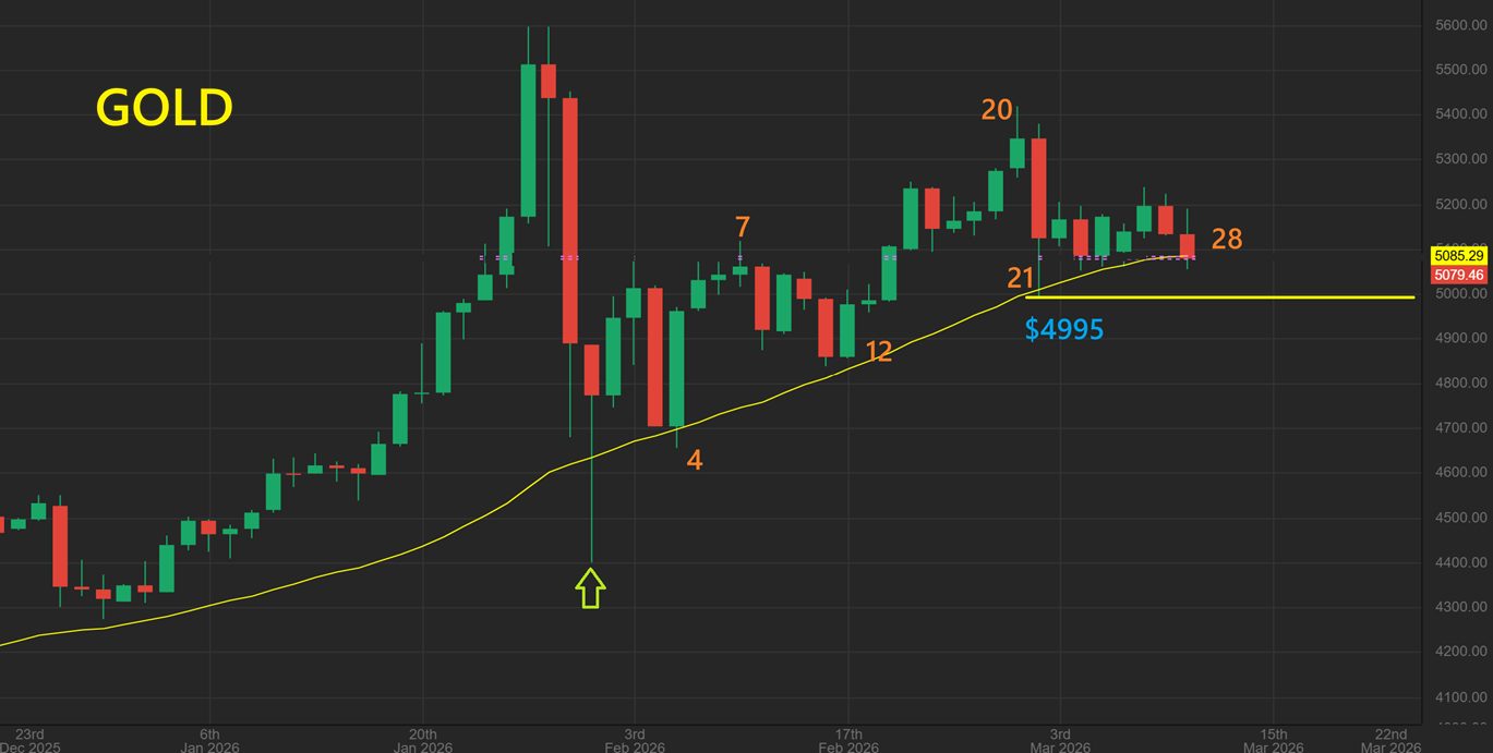 GOLD dropped with the inflation report and this was day 28 on Thursday with Spot Gold. The lows of $4995 were not broken and I would expect Gold to get down near that area as a dcl.