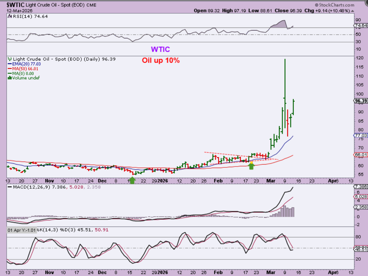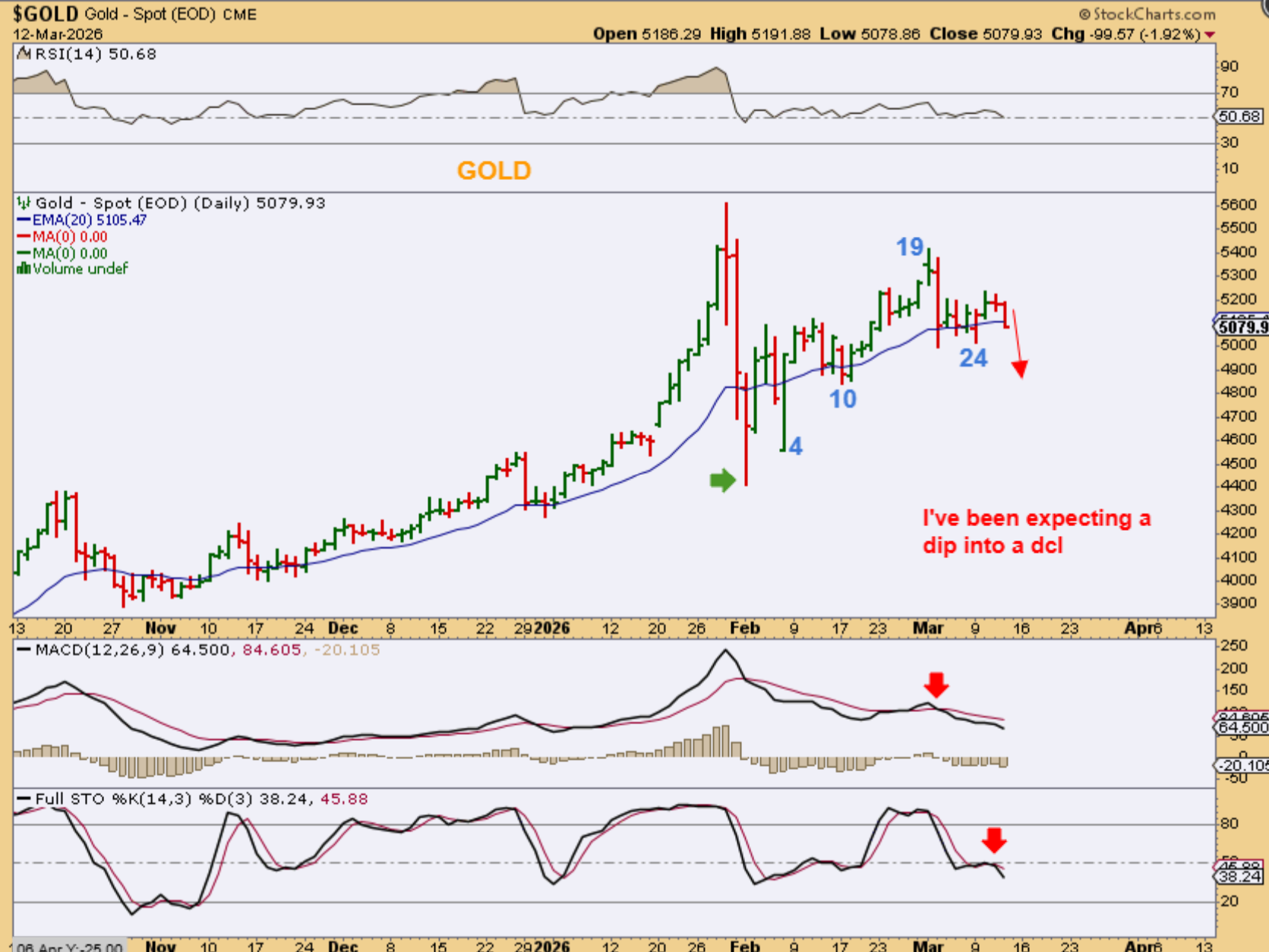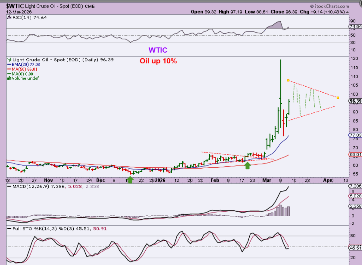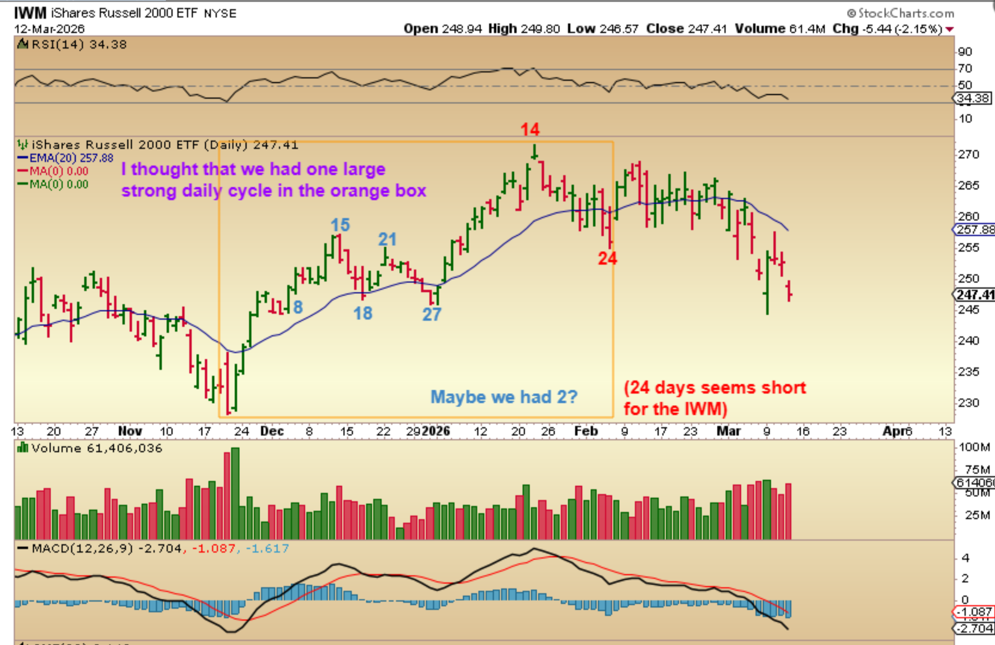 The choppiness has continued with the uncertainty in the world around us. The set up indicates that the general markets are affected by this uncertainty, bad news, war, inflation, the idea that the fed may not cut rates soon, etc etc, and so it is too weak to rally. When this happens, we often get small bounces lower over time and then an ICL forms. That ICL may not come until April or May, and I will discuss that with charts in the weekend report. As for Oil, it is bullish in the news of Oil shortages and Oil tankers not being able to deliver more Oil. This can be a temporary situation, and Oil Reserves are being released to add to Oil supplies, but right now the situation is bullish for Oil as it takes place. Gold and Silver are weaker as they came due for a dcl. Those often come around day 32ish, but it does vary lately, so it could come at any time. Please remember that in these conditions it is wise to keep positions very small or sit on the sidelines with Cash and watch to see which stock remain strong during this chop. I see Rare Earth, some Aviation / Aerospace stocks holding up, and Drones, Aluminum stocks and Uranium have held up too, so there are areas that may show relative strength and may do well when the markets bottom. I will continue to discuss this as time goes on. UMAC made new highs, RCAT, ONDS, DPRO, KTOS, etc are holding up too (earnings for RCAT & ONDS is next week). So, some areas are showing strength despite market chop.
