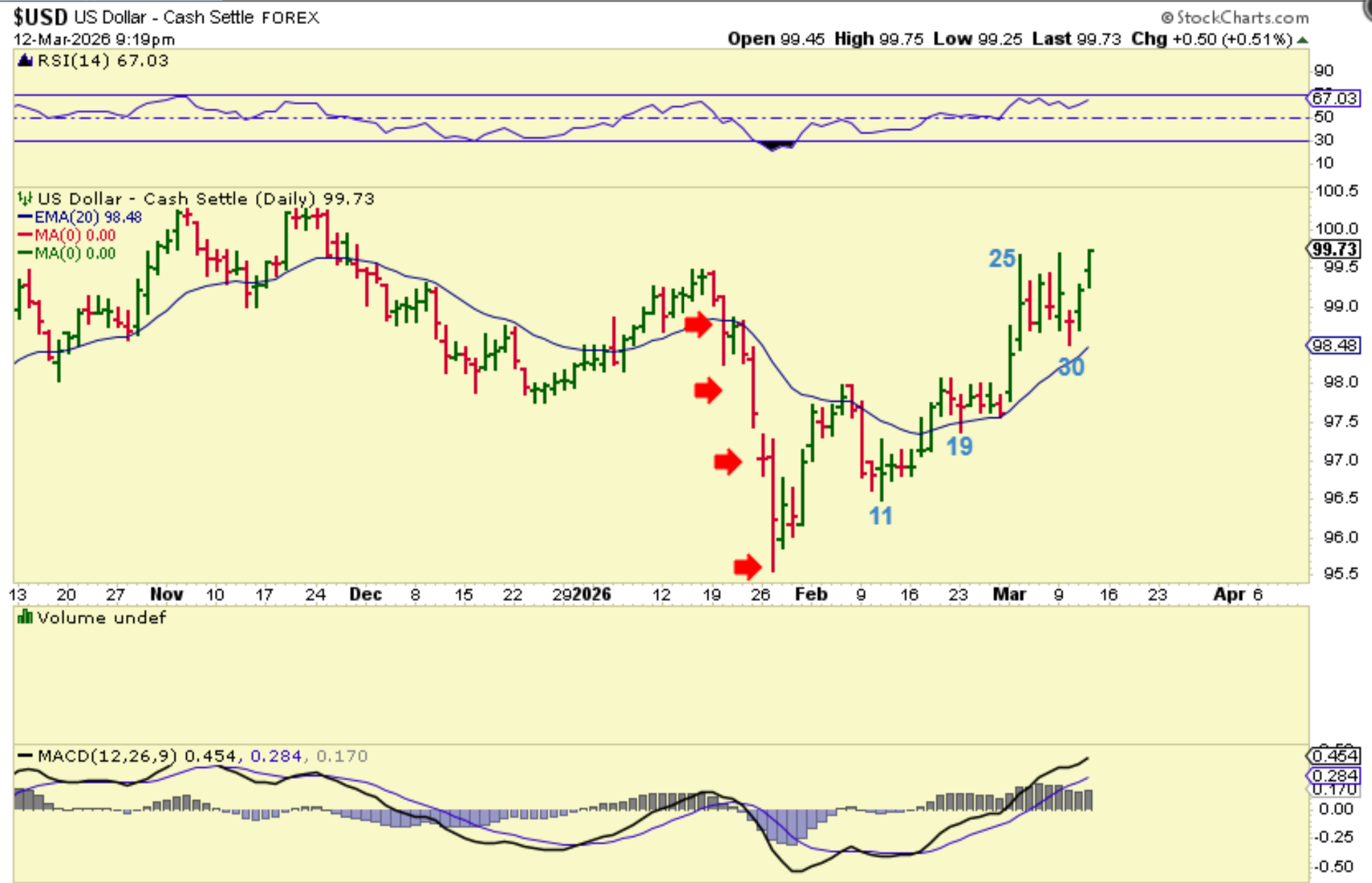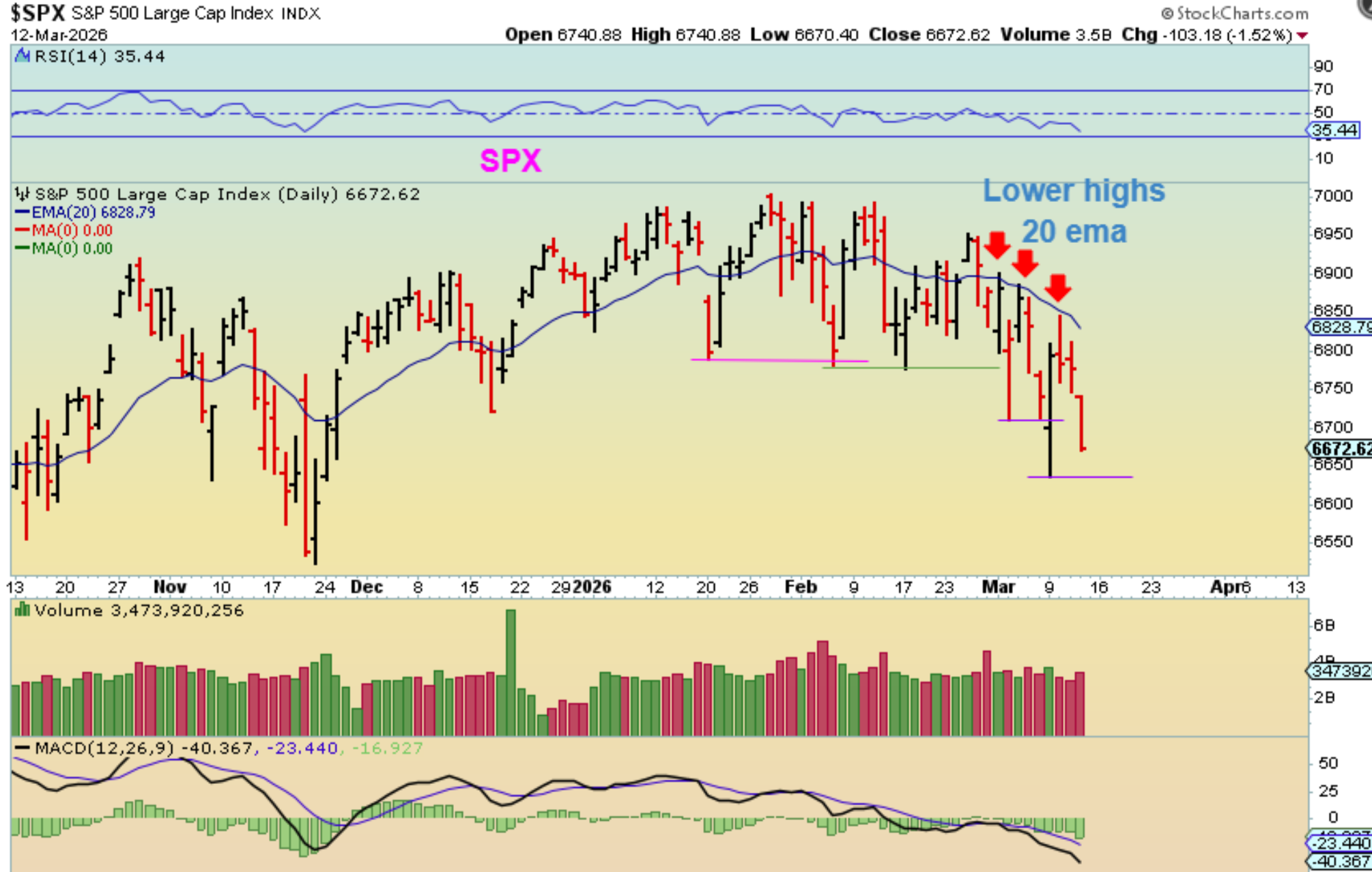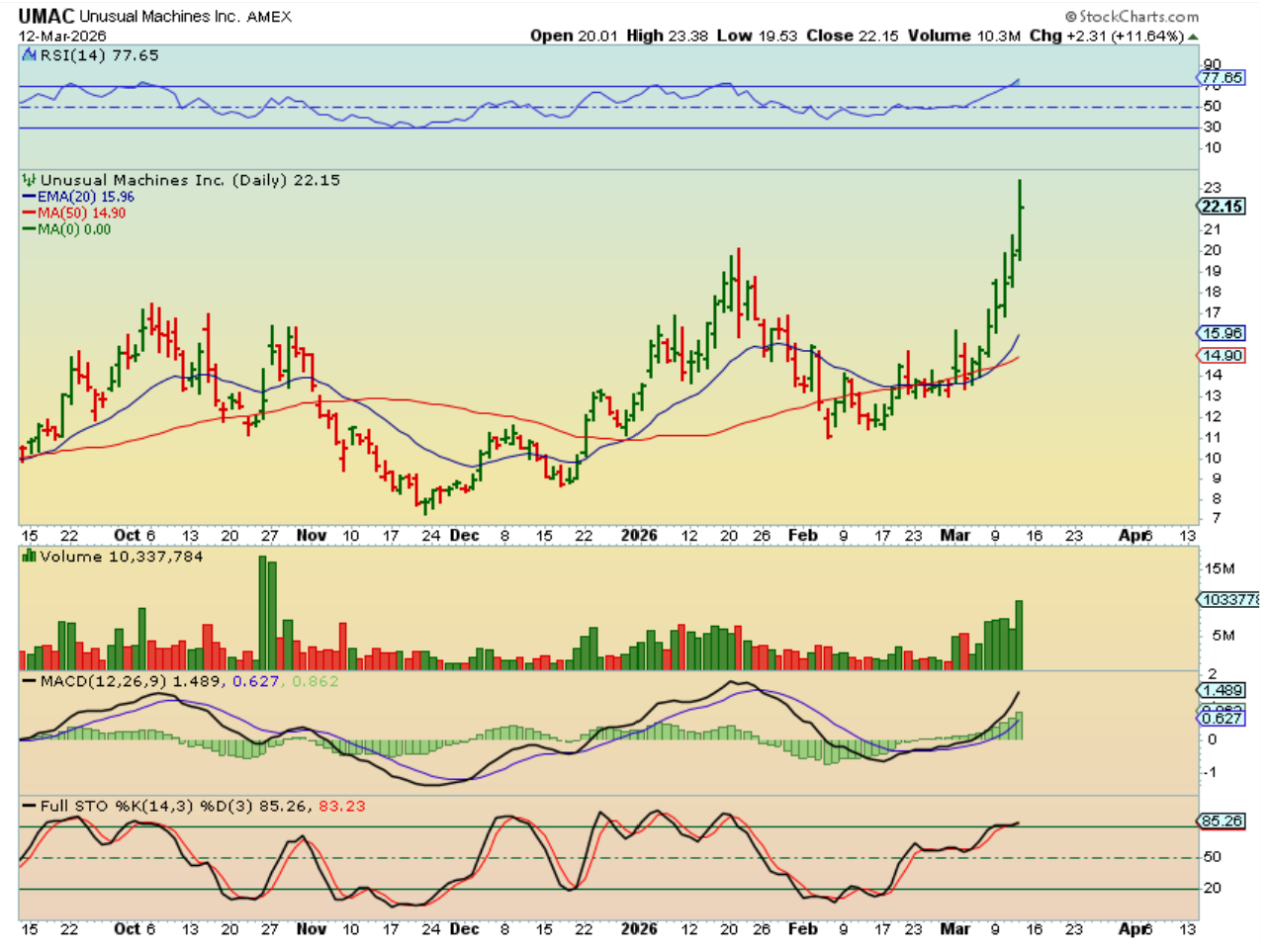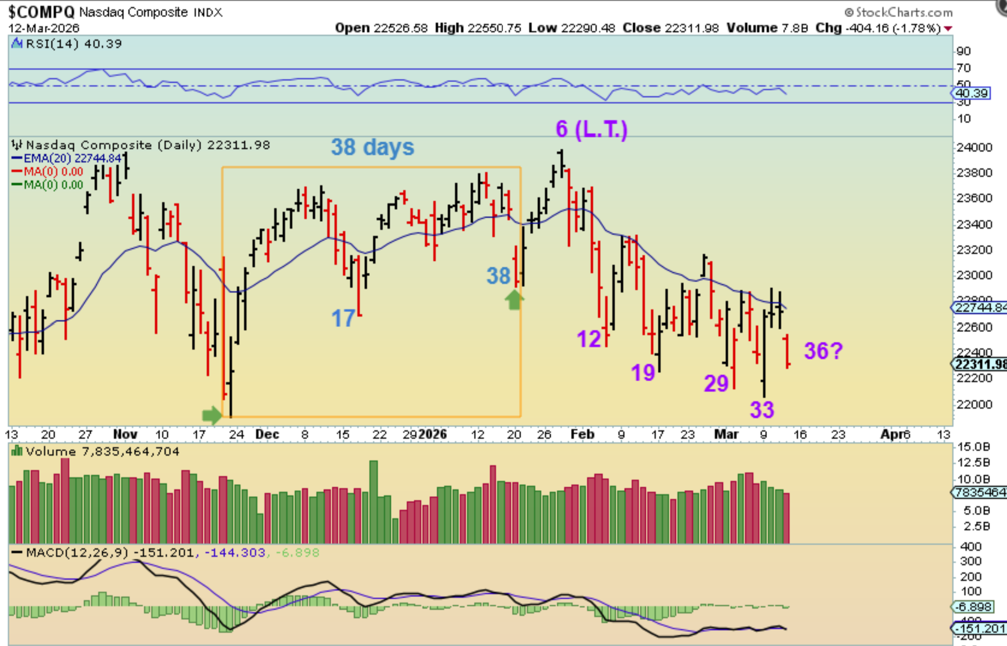 The choppiness has continued with the uncertainty in the world around us. The set up indicates that the general markets are affected by this uncertainty, bad news, war, inflation, the idea that the fed may not cut rates soon, etc etc, and so it is too weak to rally. When this happens, we often get small bounces lower over time and then an ICL forms. That ICL may not come until April or May, and I will discuss that with charts in the weekend report. As for Oil, it is bullish in the news of Oil shortages and Oil tankers not being able to deliver more Oil. This can be a temporary situation, and Oil Reserves are being released to add to Oil supplies, but right now the situation is bullish for Oil as it takes place. Gold and Silver are weaker as they came due for a dcl. Those often come around day 32ish, but it does vary lately, so it could come at any time. Please remember that in these conditions it is wise to keep positions very small or sit on the sidelines with Cash and watch to see which stock remain strong during this chop. I see Rare Earth, some Aviation / Aerospace stocks holding up, and Drones, Aluminum stocks and Uranium have held up too, so there are areas that may show relative strength and may do well when the markets bottom. I will continue to discuss this as time goes on. UMAC made new highs, RCAT, ONDS, DPRO, KTOS, etc are holding up too (earnings for RCAT & ONDS is next week). So, some areas are showing strength despite market chop.