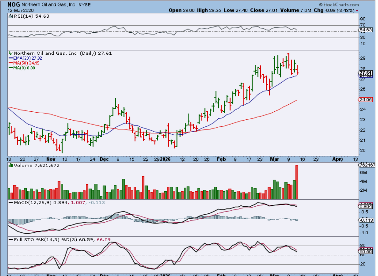 WTIC – Oil could flag or form a pennant, chopping sideways and higher to give us a larger consolidation. This is just a guess, based on past experiences with blow off tops, but we’ll have to wait and see how this plays out with the war and other circumstances that are bullish for Oil. Some Oil stocks were actually red again on Thursday, others were green.