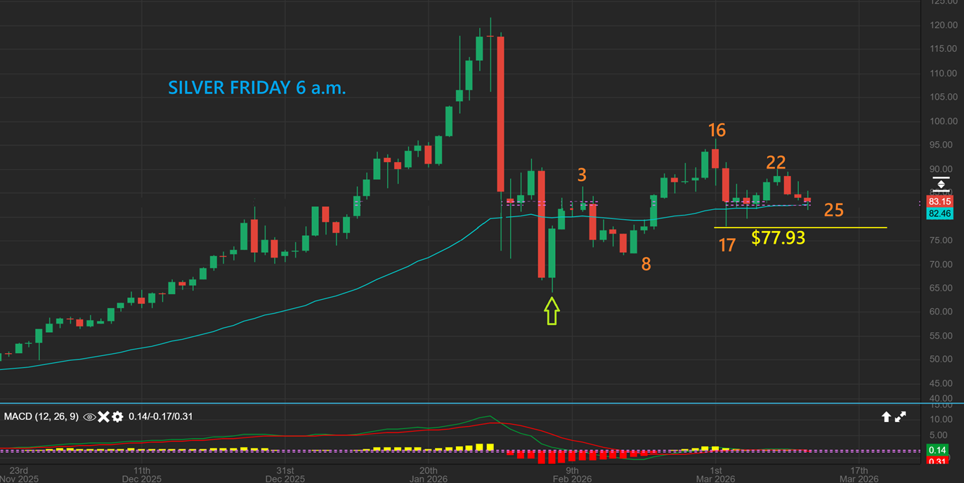 SILVER live 6 a.m. ET: Silver dipped lower and is only on day 25. he day 17 low is at $77.93 and I would expect this low to be taken out with a dcl dip.