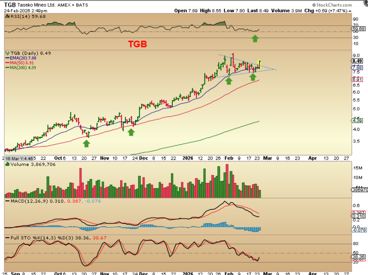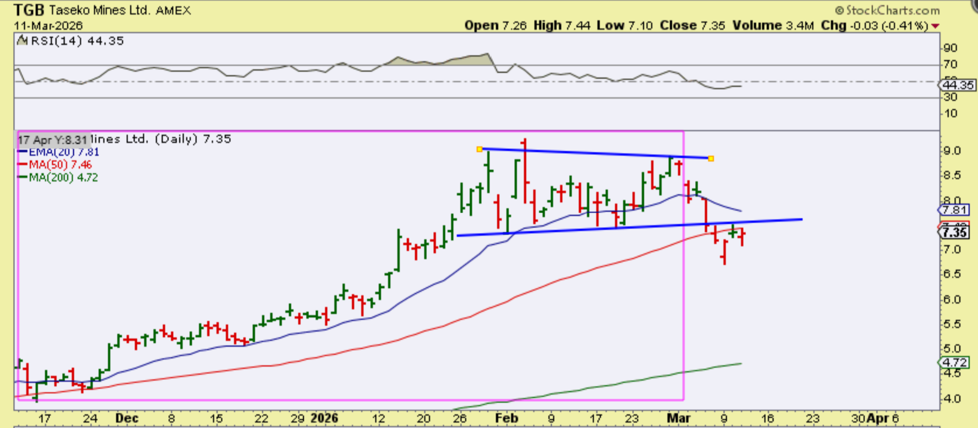 ‘Our Copper stocks were looking excellent heading into March. When Gold and Silver ‘peaked’ recently with the Iran war, you may have noticed that it affected Copper sector too. I owned TGB and WRN and they took a dive with the precious metals sector. This was TGB breaking out in late February (I owned it)…