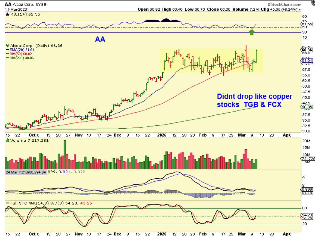 I just want to share an observation with you here. Buying has been tricky in this chop, but I noticed a couple of the stocks in the Aluminum sector near the highs again. That is much better than the copper stocks are doing.