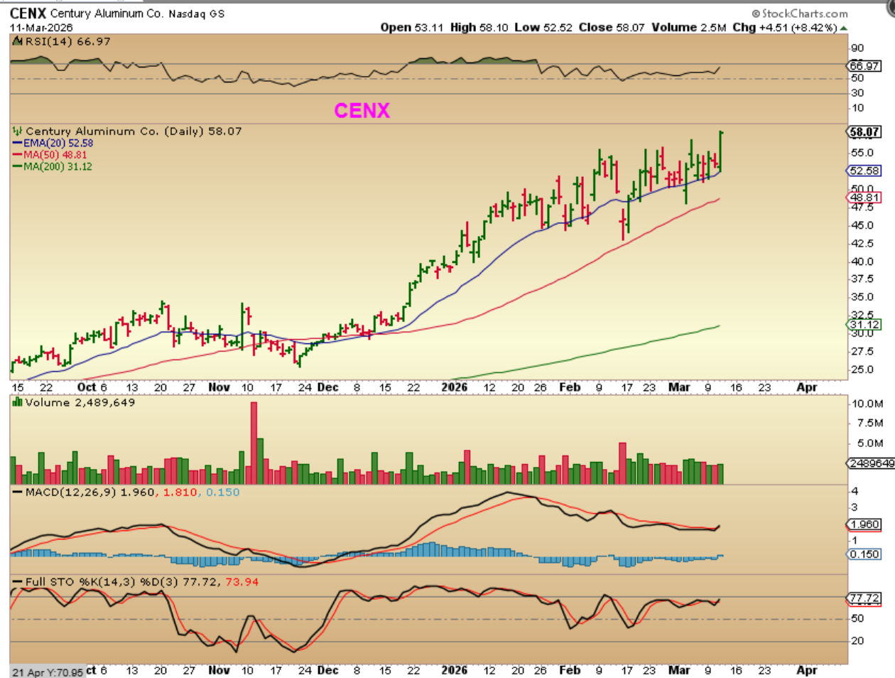 I looked at CENX, AA, CSTM, etc and they remained bullish. I was stopped out of TGB and WRN with small losses, and I don’t love the way they look yet, but I might be willing to try one of the Aluminum stocks with this recent set up. I think that CSTM is too choppy, but it is at the highs. CENX & AA look good and are also near the highs. Take a look…