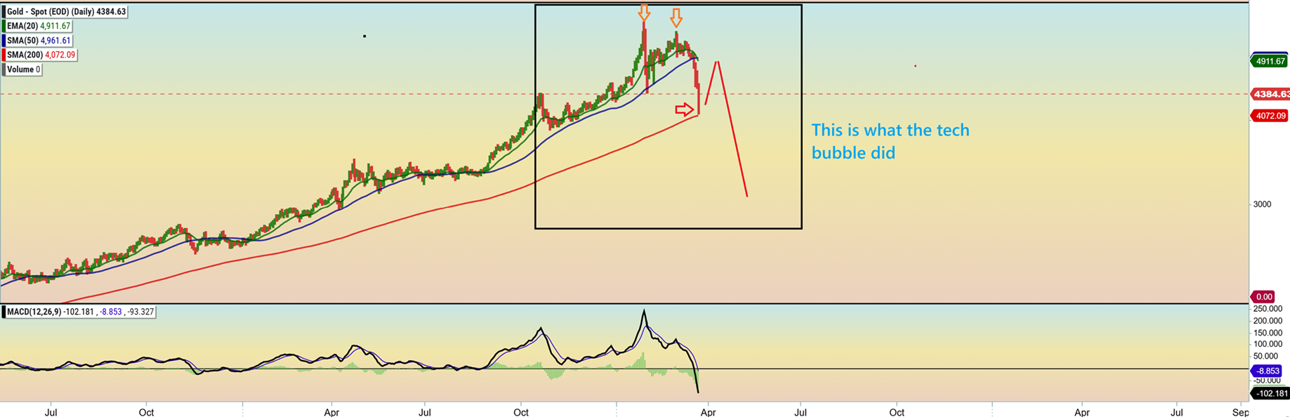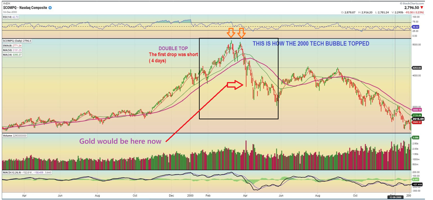 THE NASDAQ 2000 tech bubble also did a double top like what Gold just did. So I will stack the 2 charts on each other below and focus on THE BLACK SQUARE in both charts.