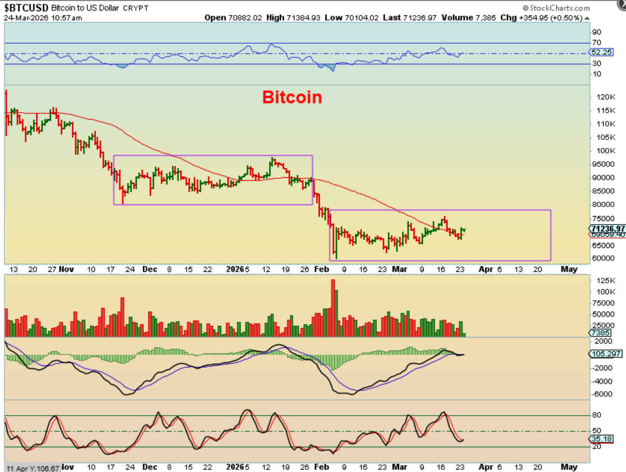 BITCOIN – We have another bounce with Bitcoin, and this was expected. Bitcoin is acting very much like it did on the last consolidation before it dropped. I do not see a strong rally coming due to cycle count, and the Weekly chart also helps us to see that this bounce may end near $80,000. How?