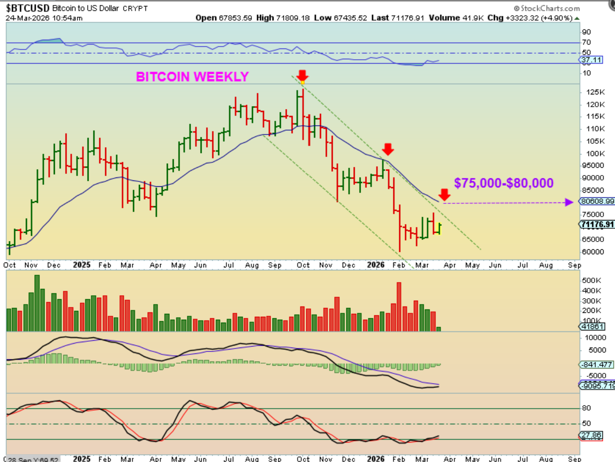 BITCOIN WEEKLY – We do have a trendline and the last rally tagged the blue 50 week ma. Both targets are between $75,000 and $80,000. We’ll see what the next 5 days brings our way.