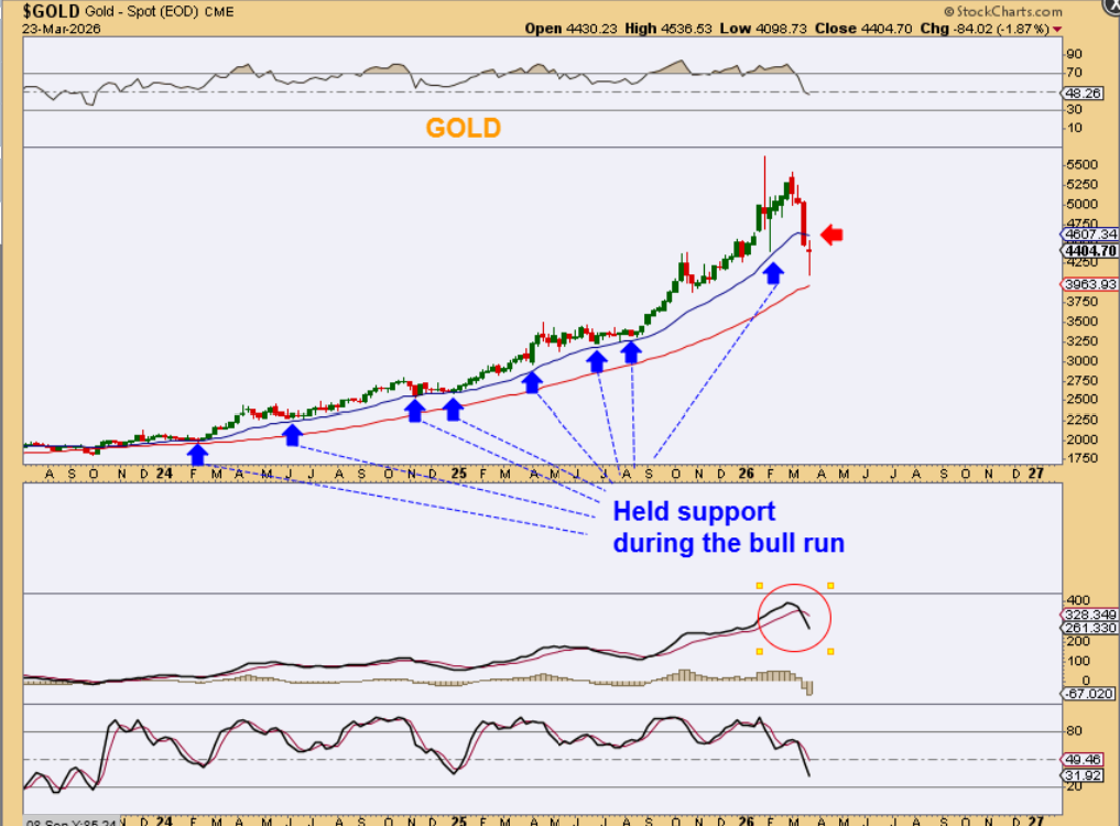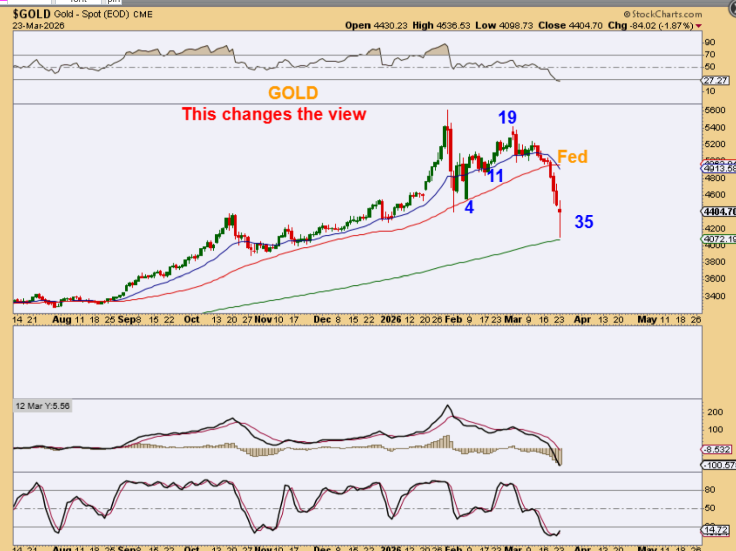 GOLD WEEKLY- Gold dropped Sunday night and bounced back as the day went on. This selling has broken the bull run pattern of finding support at the blue line.