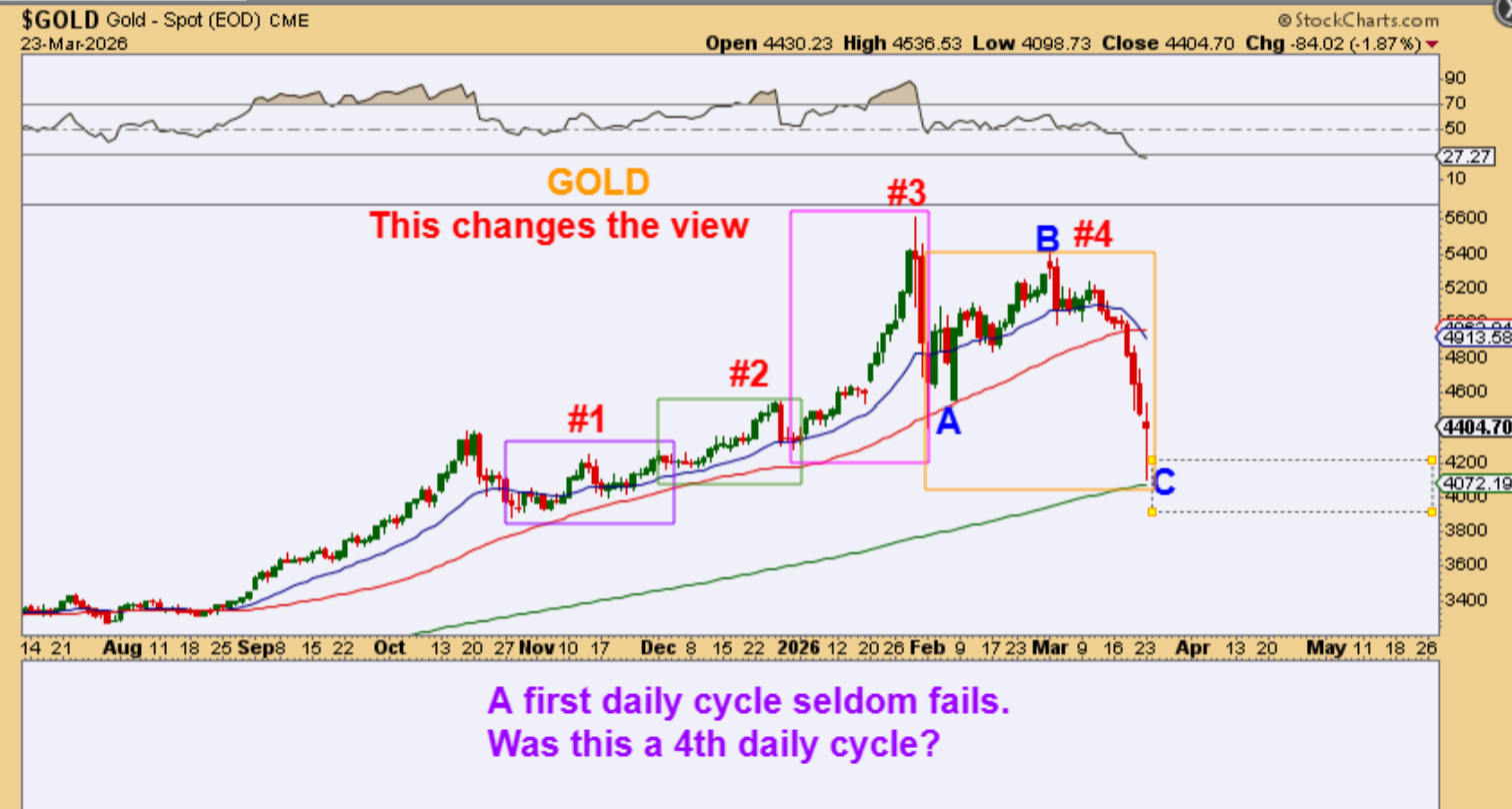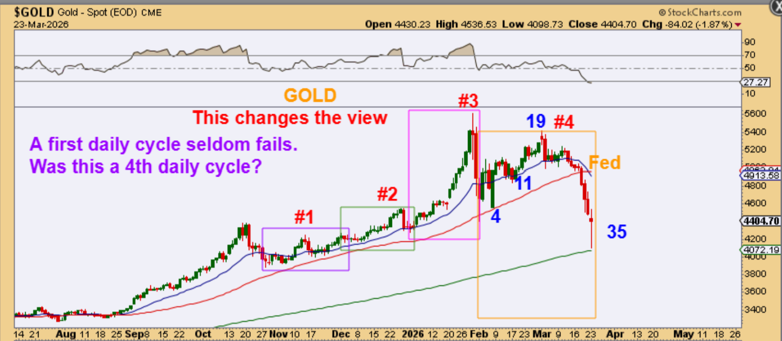 GOLD broke down below our prior Feb low, and that usually will NOT happen in a first daily cycle out of an ICL. THAT MEANS…that this might now become a final daily cycle, not a first daily cycle. Let me show you what I mean…