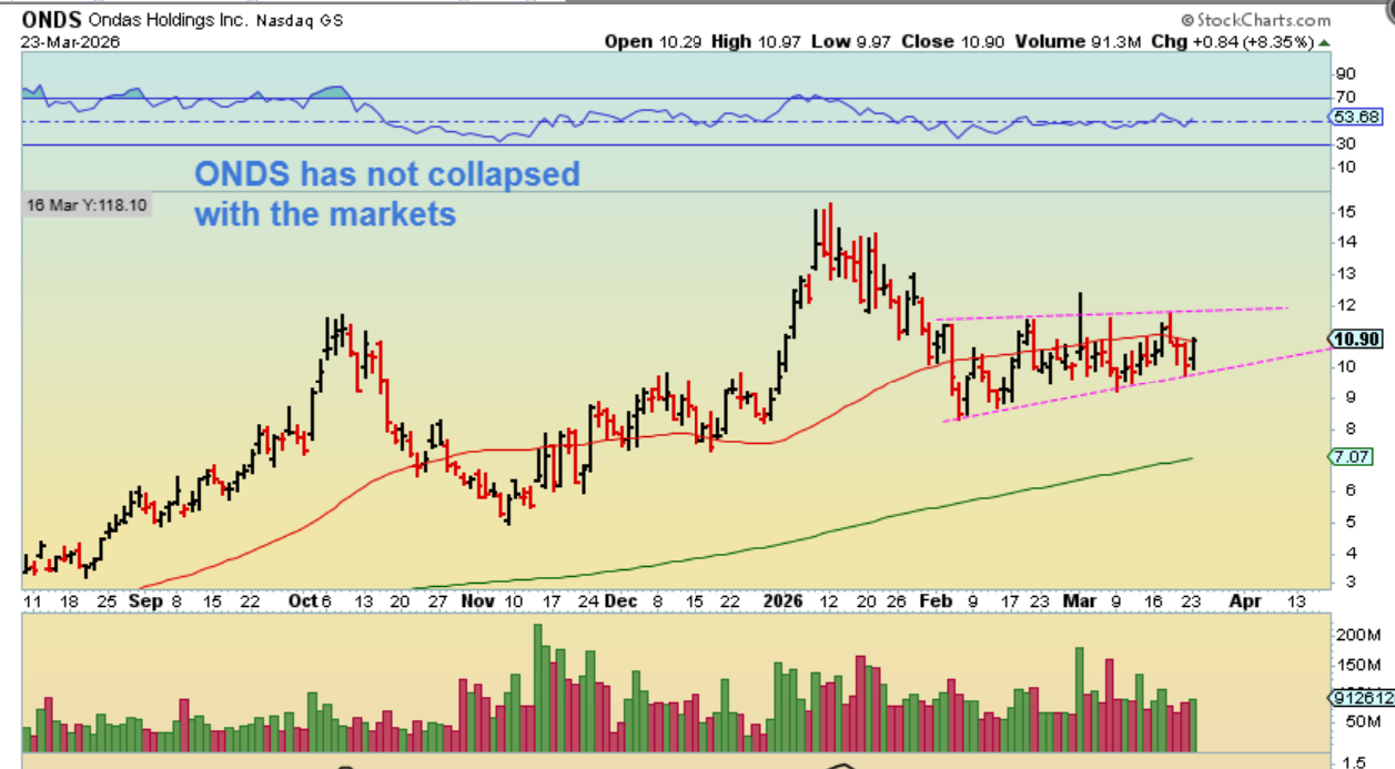 ONDS (Drones) has chopped sideways and was up 8% on Monday.
