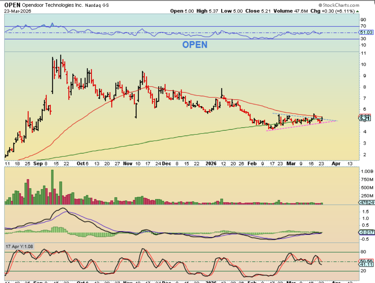 OPEN has been choppy, chopping along the 200sma for weeks actually, and the triangle may give it the energy to break out higher above the 50sma, if we have a dcl / lows in place.