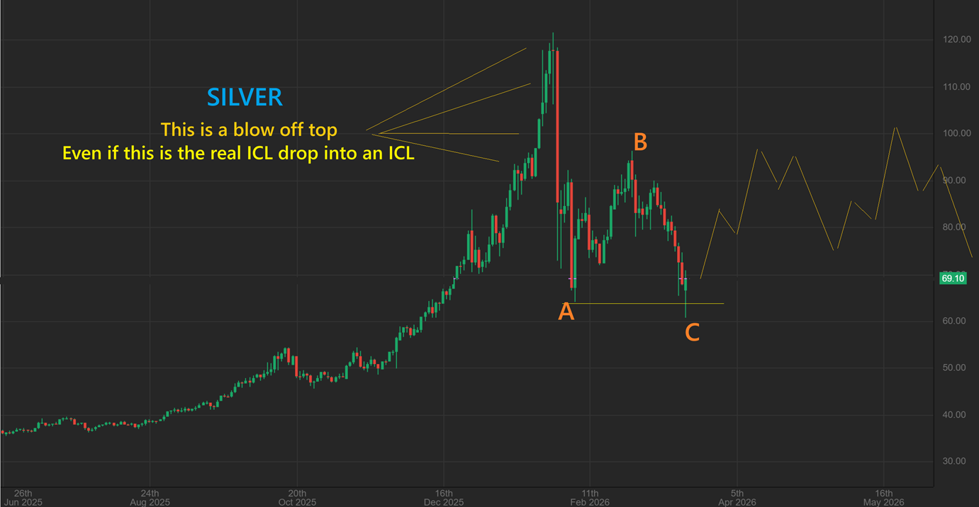 SILVER  broke the recent January lows Sunday night/Monday morning, so it too may be in a final daily cycle that leads to an ICL. That said, Silver may just chop around sideways or it may even crash again too. If we are in crash mode, like the tech bubble of 2000, then we may see a 5th daily cycle that crashes even lower.  That is what blow off tops can do.