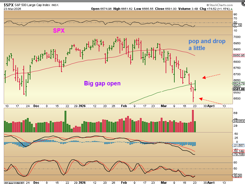 The SPX (& General Markets) Gapped open in a big way on Monday, supposedly when Trump mentioned postponing strikes on Iran’s energy for 5 days because of talks that were progressive with Iran. Iran denied that those talks ever took place. You can see that the markets gapped open, ran even higher, and then sold off to that gap again. The last few times this happened, the selling continued.