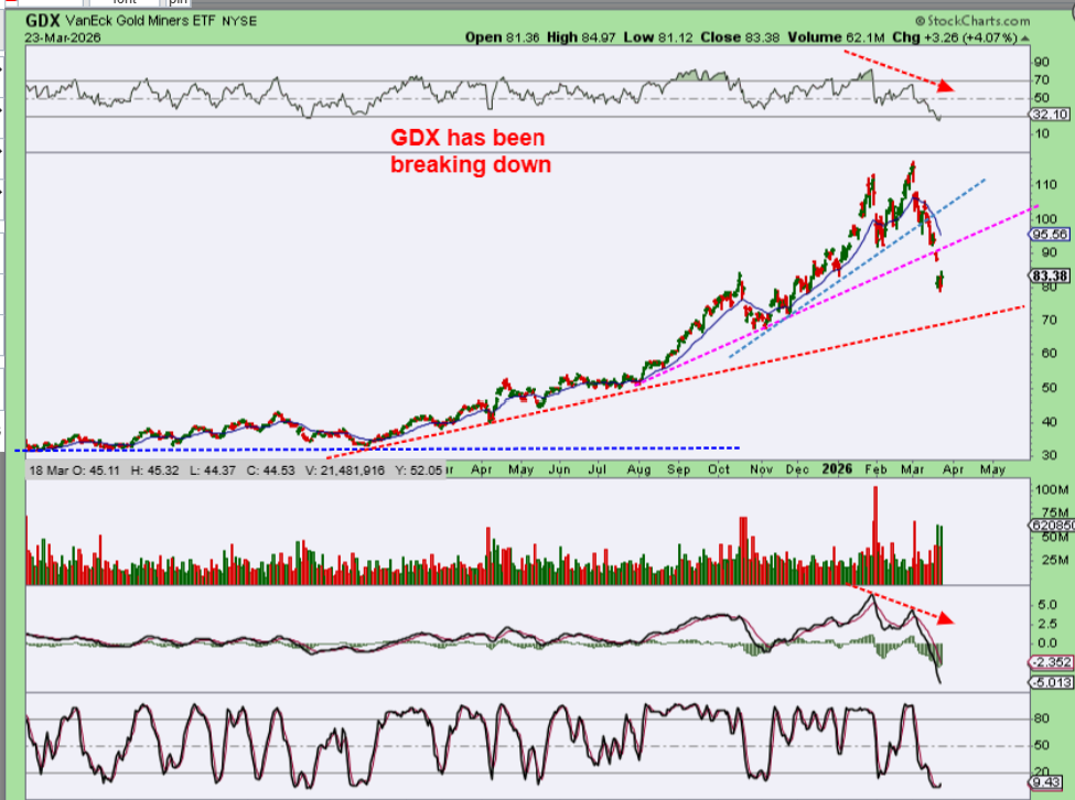 GDX #2 (Same chart): That double top had strong negative divergence. The RSI didn’t drop to 50%, it is at the lows and the MACD also had divergence and then crashed. This looks like it would be a ‘sell the bounce’ if you still own miners, or raise stops along the way higher to get stopped out on a drop. This set up could also be a ‘short the bounce’ (DUST/JDST). We’ll watch how it unfolds.