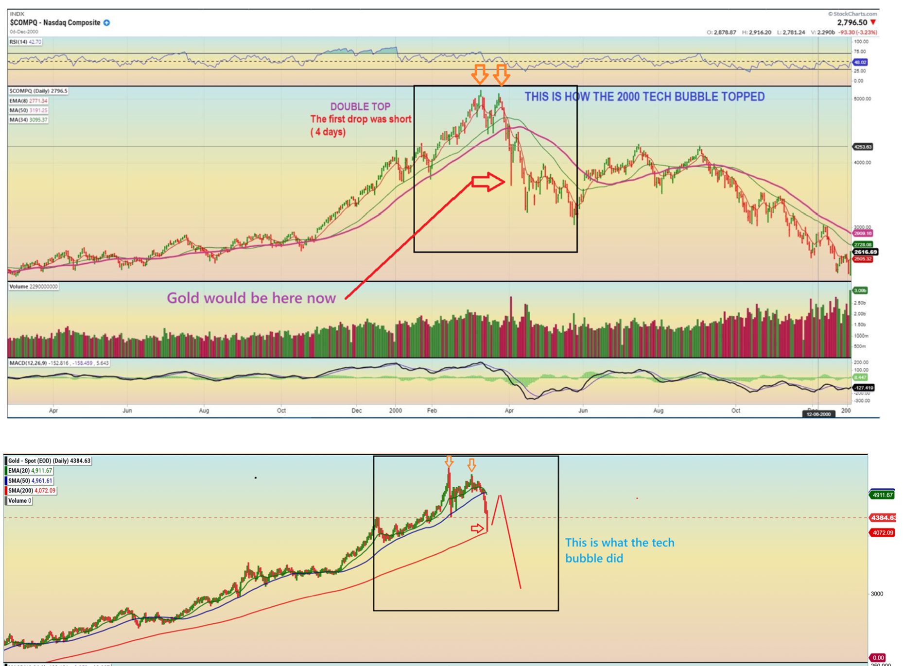 Scroll up and down and look at the similarities of the Nasdaq top & drop and Golds recent top & drop.