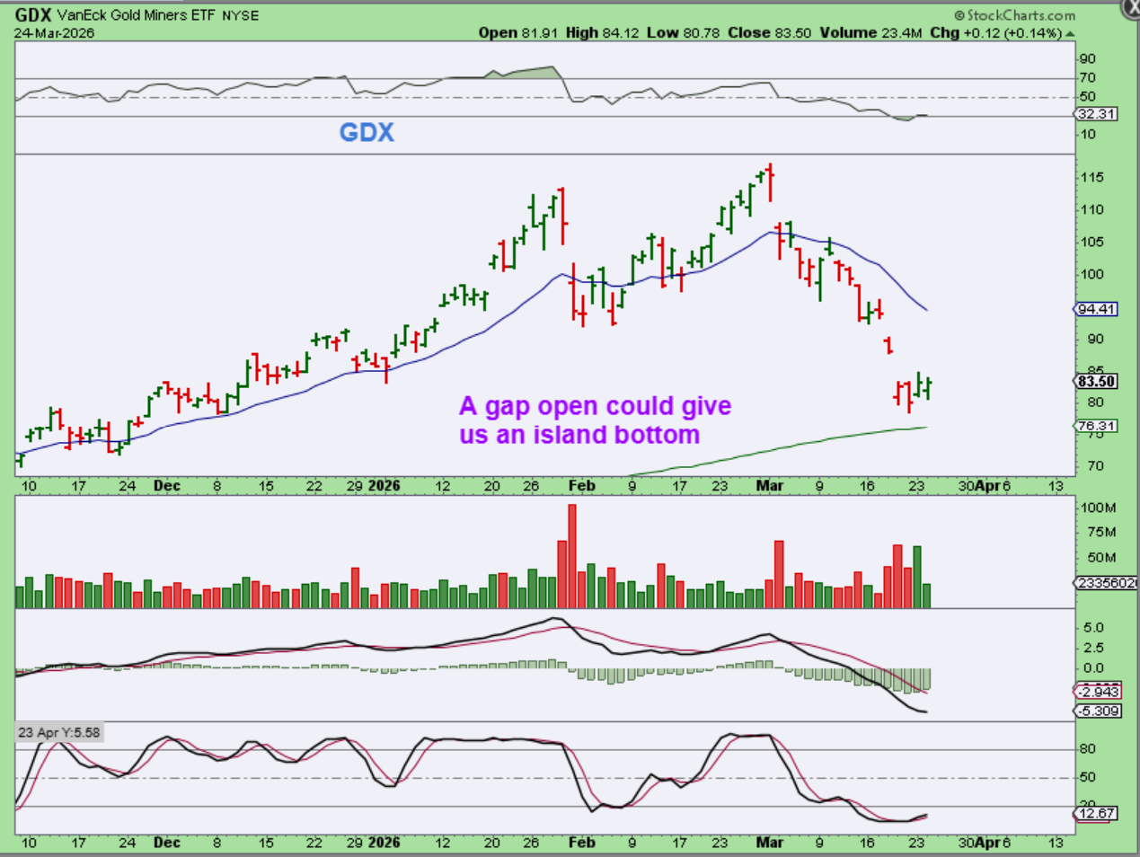 GDX is chopping sideways after gapping down. A gap open leaves behind an Island Bottom, which is usually at least short term bullish.