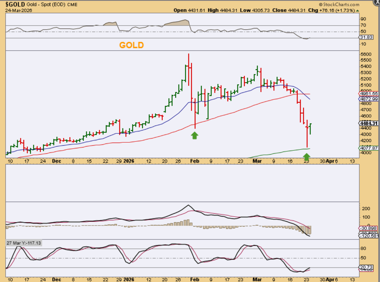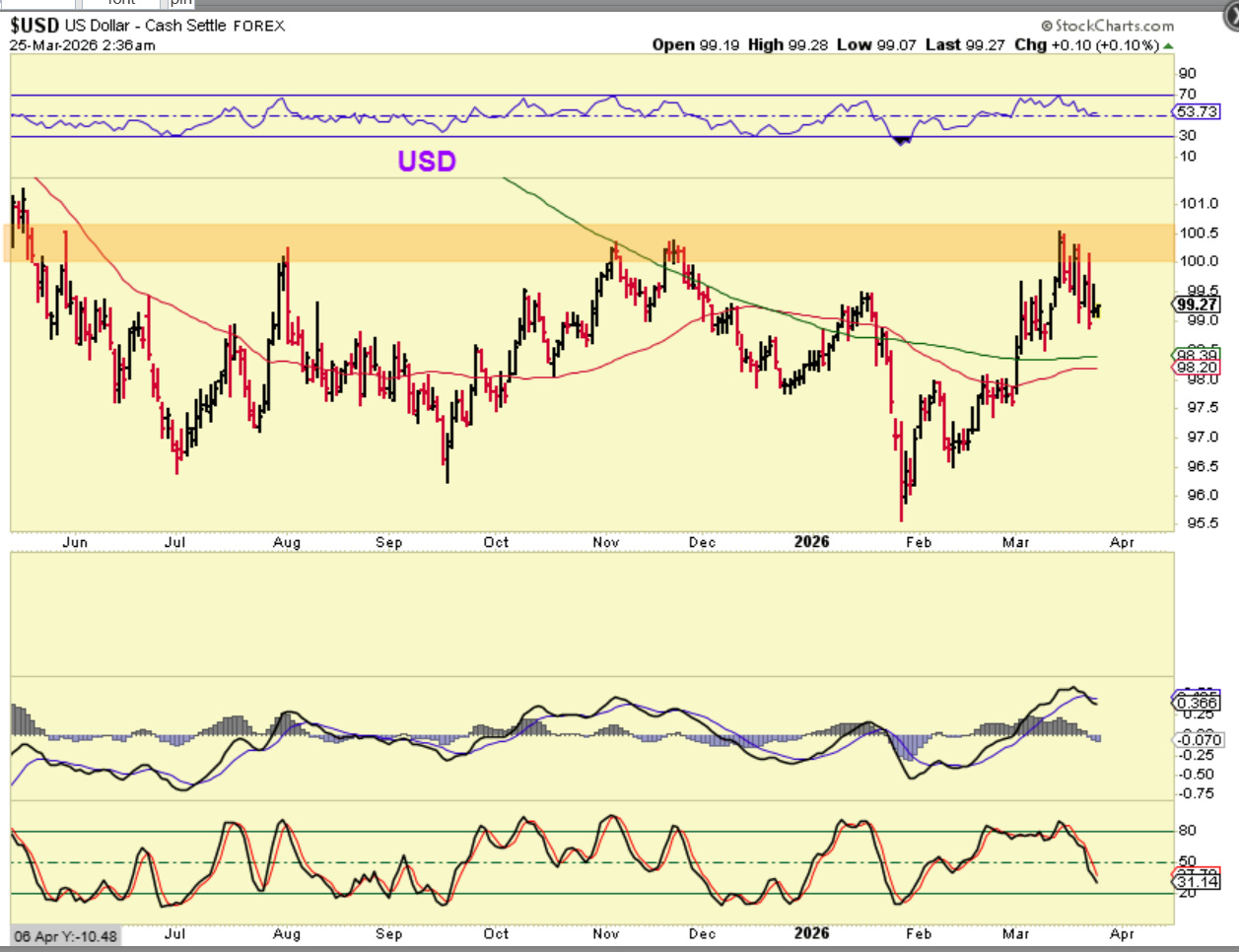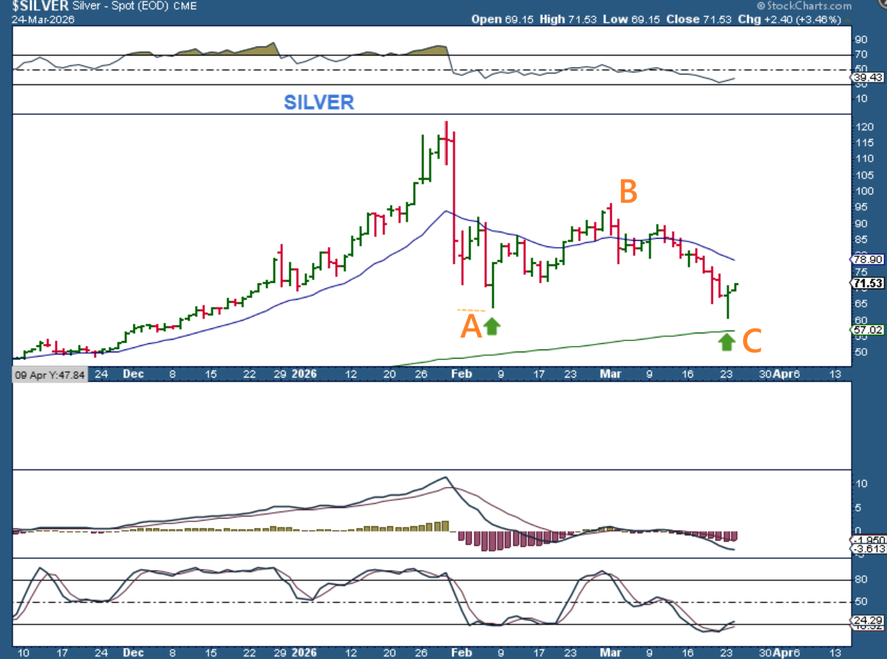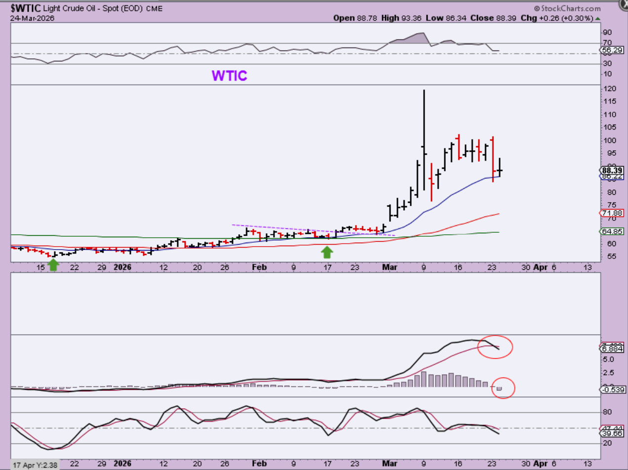 WTIC – Oil dropped on Monday when a ‘5-day pause’ in the Iran war was announced. This could become a half cycle low if Oil resumes the upward run after this 5 day pause ends.