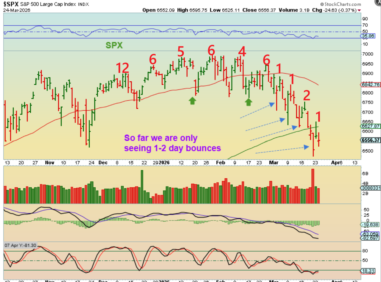 SPX – I’m just pointing out the number of days that the markets bounced out of the dips. On the left bull side, we often got 5 or 6 days higher out of the low with a bullish bounce. Lately we get 1 or 2 days out of a dip & it rolls over. I do think that when we have the dcl in place (& we might now) We’ll get maybe 5-7 days higher before it rolls over. It would be a weaker bounce though.