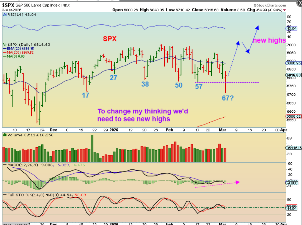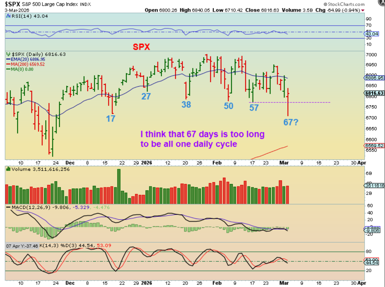 SPX #1 – We broke the day 57 low and this is now starting to look more like a ’rounding top’, with lower highs and lower lows. Day 67 just seems too long to be all one daily cycle. It’s not impossible for all of this chop to just be uncertainty that clears up, but it seems more likely to continue and then roll over.